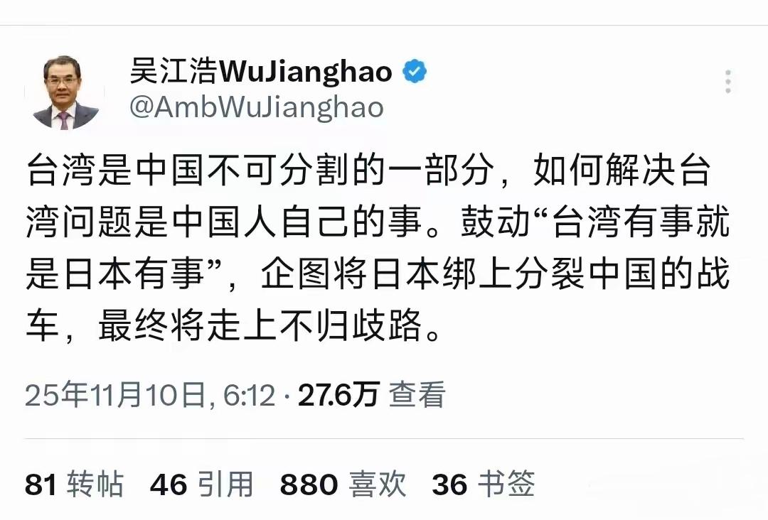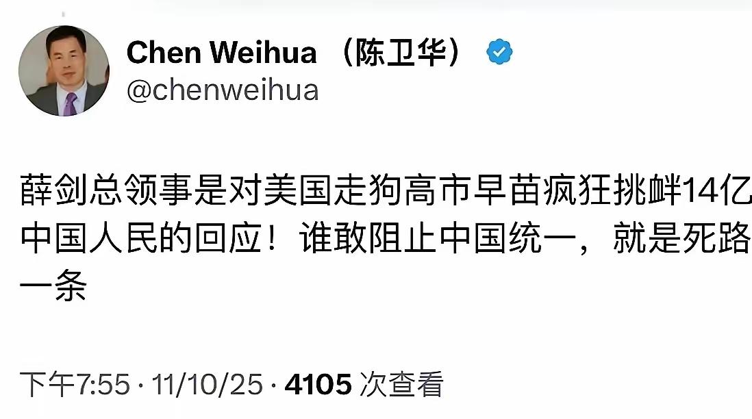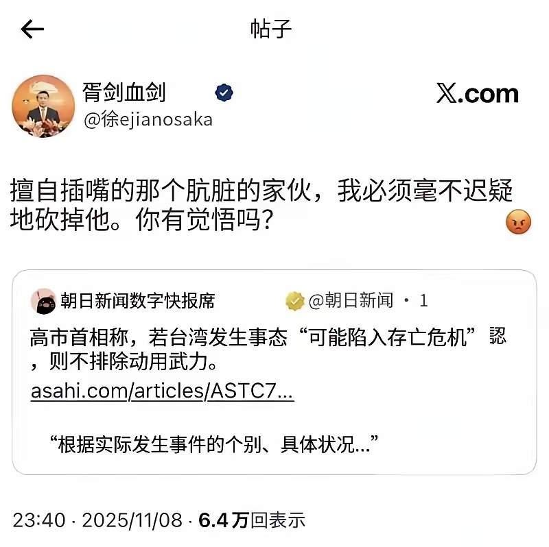 薛剑“一剑封喉”引爆琉球! 因为高市早苗的涉台不当言论,中国驻大阪总领事薛剑迅速做出反应,以“斩首说”干净利落将其“一剑封喉”。 薛总领事这样说:“擅自插嘴的那个肮脏的家伙,我必须毫不迟疑地砍掉他。你有觉悟吗?” “斩首说”一出,吓得琉球某些人瑟瑟发抖。他们没想薛领事“出剑”如此干脆利落,连个提前暗示都没有,更别提商量了。于是,心怀鬼胎的琉球人要求驱逐薛剑出境。但驻日大使吴江浩随即发文力挺:“台湾是中国不可分割的一部分,如何解决台湾问题是中国人自己的事。鼓动‘台湾有事就是日本有事’,企图将日本绑上分裂中国的战车,最终将走上不归歧路”。而中国日报社欧盟分社社长陈卫华更是直接点名批评高市的做法是自寻死路。 或许高市早苗还不知道,自己的不当言论有多危险,就连美国总统特朗普都害怕的赶紧撇清关系,称“有些盟友不一定是朋友”。而高市正将自己推入悬崖,将日本推入深渊。任何涉及台海分裂的事我们都零容忍,台湾是中国不可分割的一部分,是我们自己的事,谁都别想插手,哪怕说一句都不行,否则剑出头落。不信高市可以试试!