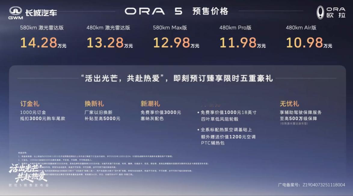 10.98-14.28万的欧拉5会让你动心吗?欧拉现在目前越来越走向小资、个性化了,总体的体感让人觉得就是不妥协、个性化的小车,主打是”路上见不着,就我一个人”的个性风格。从10.98-14.28万的价格定位上,可以说是精准找到用户的需求了。教授觉得这台车,喜欢的人会很喜欢,买的人,也会马上下订,要是让你选的话,会选这台好开智能又有颜值和科技感的小车吗?附欧拉一些配置:小型SUV基础参数:4471*1833*1641mm,轴距:2720mm点击功率:150kW驱动形式:单电机前驱电池:磷酸铁锂(短刀电池)续航:480km-580km悬架系统:前麦弗逊后多连杆车载系统:Coffee OS 3车技芯片:4nm芯片/24G+128G内存存储智驾芯片:Orin-Y(200TOPS)试驾硬件:1激光雷达+3毫米波+12超声波+2前置摄像头车身颜色:绿/灰/蓝/白/米/红内饰颜色:白/棕/灰轮毂尺寸:18寸轮毂 225/60内饰空间:全景天幕+兴和氛围灯+仿皮座椅屏幕:15.6中控屏+10.25液晶仪表屏(支持HiCAR/Carplay/Carlink)其他配置:7安全气囊、母婴级材料、540°全景影像预售区间:10.98万 480km Air版主驾电调+副驾手调/6气囊/热泵空调/自动雨刮/定速巡航手动尾门11.98万 480km Pro版前置行车记录仪/ACC/主副驾电调+通风+加热/全景天幕+遮阳帘/电尾门/手机无线快充12.98万 580km Max版副驾腿托/方向盘加热/氛围灯13.28万 480km 激光雷达版激光雷达/城市NOA/泊车辅助14.28万 580km 激光雷达版后视雷达/副驾腿托/氛围灯这里面的配置,其中Air版是低配,一般来说不销售。整体车型续航480km起步,高配是580km。需要激光雷达的话,约莫是+1.3万上配置,如11.98万的Pro版+1.3万上13.28万的配置,顶配的话,教授觉得还是偏贵的。在现今这么卷的市场里面,15万左右的区间,是不乏中型SUV的。所以主打还是女性化+个性车型。预售权益:1000抵3000元最高以旧换新5000元补贴全系标配热泵空调预售权益上,有约莫2000元的价格区间,教授推测可能上市价格,会有5000-6000元的价格叠加,最终起售价在9.99万之间。那么问题来了,9.99万的欧拉5,是你心仪的小车吗?