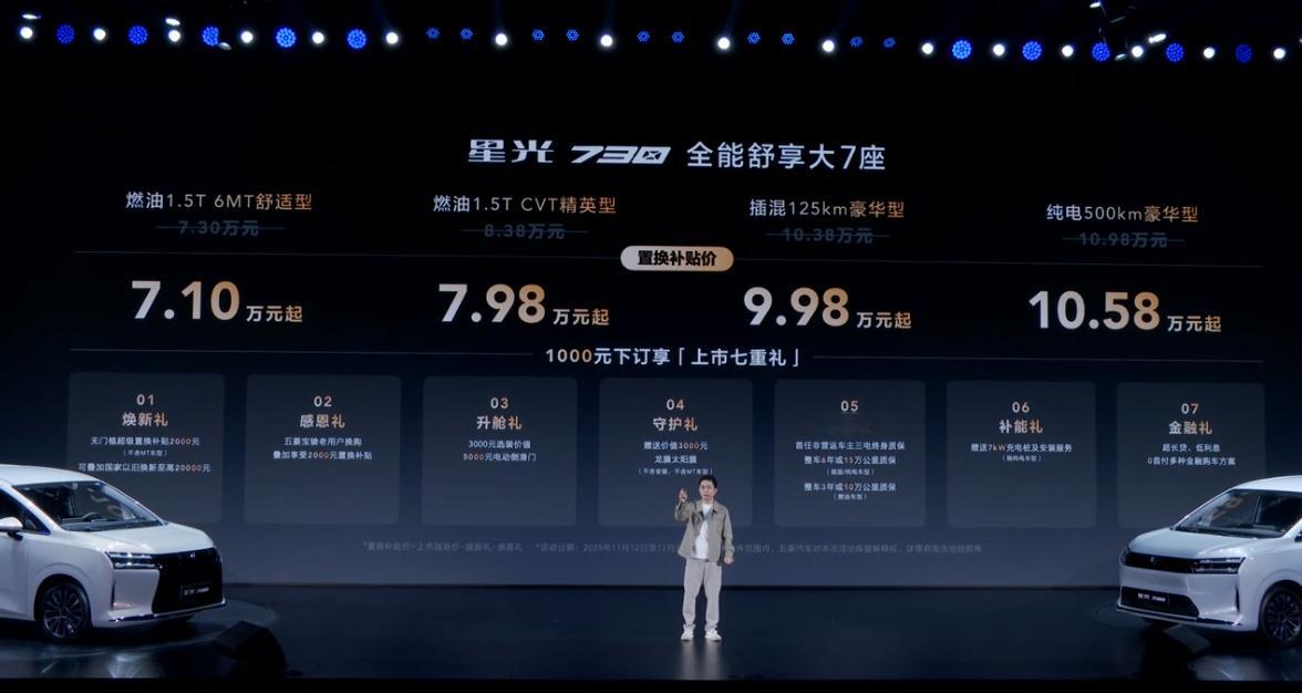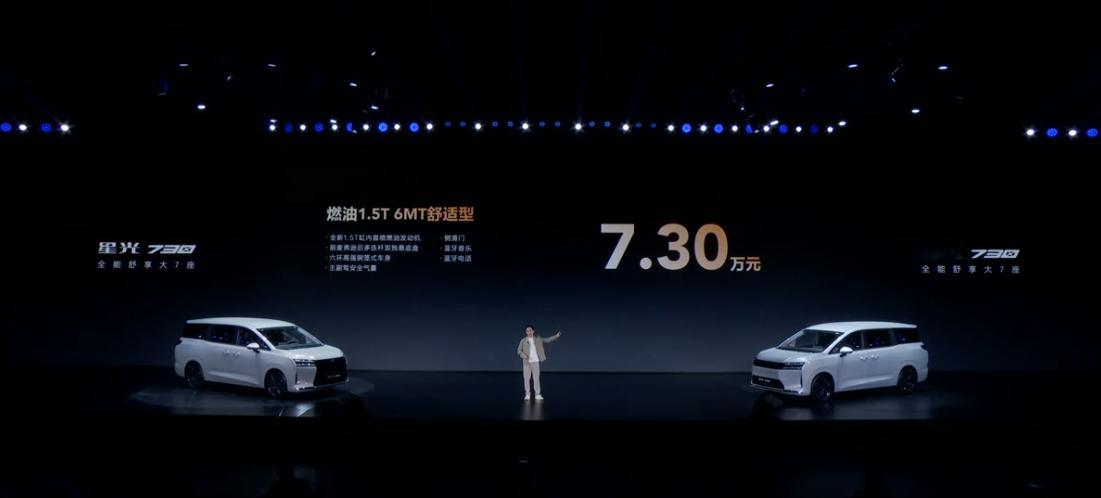 7.3-10.98万 星光730zui便宜的MPV七座了价格比预售便宜了3K,五菱的配置也都挺厚道的,可手、可油、可混动也可以纯电,即使是纯电版本,也是最便宜的500km 7座车(10.98万)。不喜欢纯电的话,7.3/8.38万可以满足手/自动挡的需求。总体的配置来说,基本精英版就啥都有了,豪华型纯粹是一些科技配置的升级,因此用不上混动/纯电的话,两个油车版本就够用了。宝骏还是那个宝骏,SKU不多,直接面对选择,是非常好评的,要是预算非常紧张,但又要一台10万左右的7座车,那么这个选择依然是星光730的,市面上还是没对手啊。一下是730的一些参数:基础参数:4910*1850*1760mm,轴距2910mm(中型MPV)驱动形式:汽油/插混/纯电布局:2+2+3(七座)发动机参数:1.5T/1.5L(混动)发动机功率:130kW变速箱:MT/CVT电机功率:145(插混)/100kW(纯电)电池:磷酸铁锂(神炼电池+液冷)纯电充电速率:2C电池容量:20.5kWh/60kWhCLTC续航:125/500km悬架:前麦弗逊后多连杆轮胎尺寸:16寸/17寸外观颜色:白/灰/黑/紫内饰颜色:胡桃棕/暖沙棕座椅功能:前排180°放倒/二排座椅160°调节/三排座椅127°调节7.30万 1.5T 6MT 舒适型16寸轮毂/钢轮圈/后驻车雷达/二排ISOFIX接口/多功能方向盘LED远近光灯+尾灯+刹车灯+转向灯/机械挡把/8层2K车漆3.5寸TFT仪表/收音机/织物座椅/主副驾手调/单蒸空调/2喇叭8.38万 1.5T CVT 精英型17寸轮毂/铝合金轮圈/360高清影像+180透明底盘/二三排ISOFIX接口皮方向盘/皮座椅/主驾电调副驾手调/无钥匙一键启动/定速巡航12.8液晶中控/外后视镜加热/后挡风加热/双蒸空调(后排出风)手机Hicar+Carlink+DLNA/6喇叭10.38万 插混 125km豪华型125km续航/低风阻前脸/电子怀挡/手机远程控制/蓝牙钥匙10.98万 纯电 500km豪华型500km续航选配配置:右侧电滑门上市礼遇:2000元置换补贴(以上价格含)宝骏老用户2000元补贴(以上不含)3000元购电动门