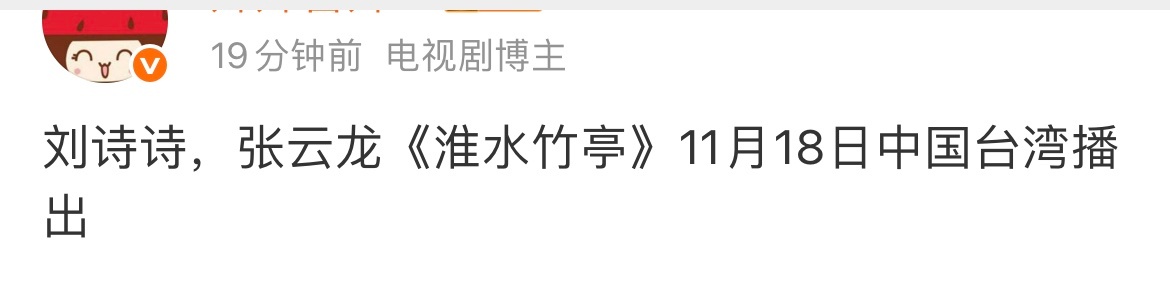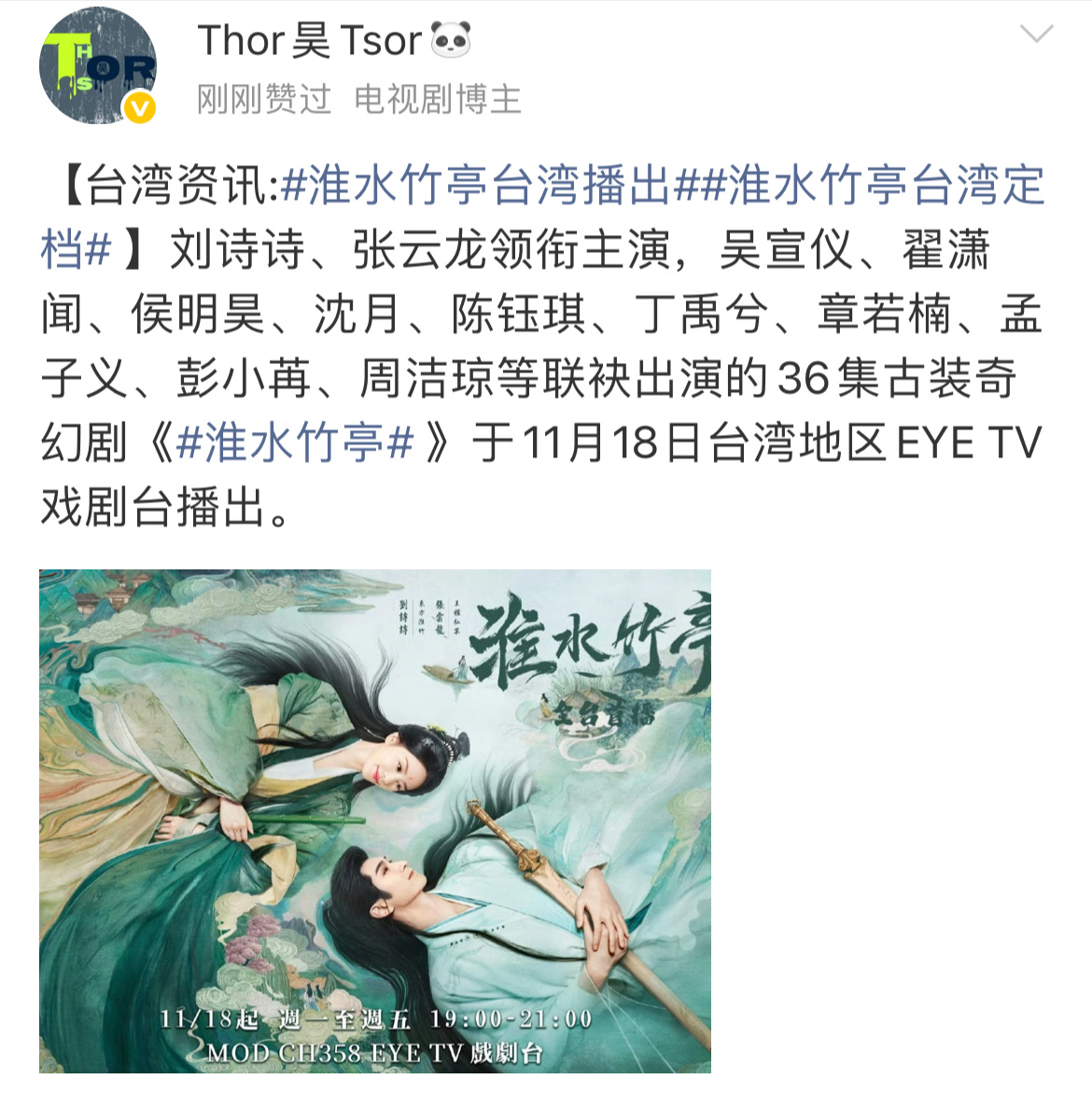 刘诗诗张云龙《淮水竹亭》继韩国上星后,台湾11.18日开始黄金档上星!至此,刘诗诗所有剧都上星了