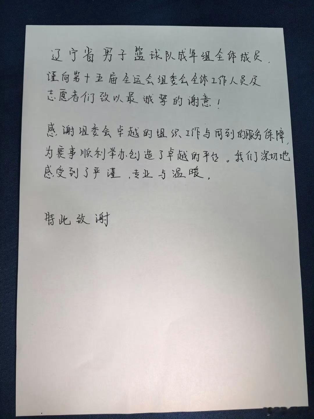 全运会男篮成年组结束第十五届全运会征程赛后辽宁队打扫更衣室并留下感谢信