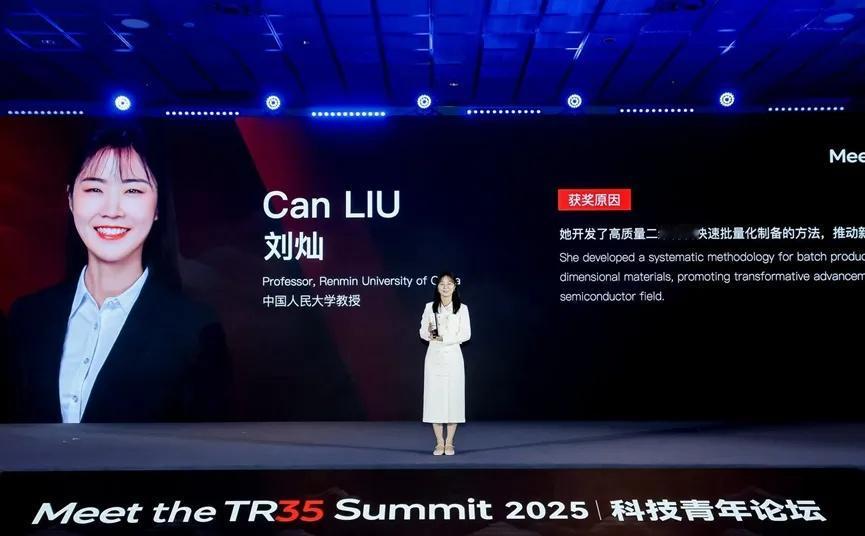33岁刘灿,已破格升任中国人民大学教授 11月12日,微信公众号“中国人民大学”发布文章《3年,她从博后到教授!》,介绍了现年33岁的该校物理学院教授刘灿。 据该校官网介绍,刘灿2014年本科毕业于西北工业大学,2019年博士毕业于北京大学,2019-2022年通过“博新计划”于北京大学从事博士后研究。 2022年,博后出站的刘灿入职人大,受聘副教授;2023年,获批国家自然科学基金优秀青年科学基金项目;2024年,主持国家重点研发计划子课题,任课题组长;2025年,破格晋升教授。发表一作/通讯作者论文30余篇,其中包括Science3篇、Nature子刊9篇,申请国家发明专利16项。 近日,刘灿教授还入选了《麻省理工科技评论》“35岁以下科技创新35人”(TR35)亚太区榜单。 创刊于1899年的《麻省理工科技评论》是全球历史最悠久、最具影响力的科技杂志和智库之一。每年,它会从多个维度寻找专注于新兴科技创新,并有望通过技术落地来改变世界的青年力量,由此形成TR35榜单。 刘灿主要从事芯片用二维材料制备及光谱学研究。 文章提到,“如果把今天广泛使用的芯片,比作已被精耕到极致的‘硅晶圆土地’,那我的工作,就是去寻找并开垦全新的‘二维晶圆良田’。”刘灿这样形容自己的研究。然而,如何将实验室里指甲盖大小的样品,转化为可投入产业应用的高质量、大面积晶圆,是全球科学家面临的共同挑战。 面对这一问题,刘灿团队提出了一种“晶格传质-界面生长”的新方法。该方法突破了二维材料在层数控制与堆垛结构上的技术瓶颈,实现了高质量二维单晶的可控快速生长,速率可达每分钟50层。 此外,她与团队合作开发的“界面单原子供应方法”,成功实现了12英寸二维半导体晶圆的批量制备,推动二维材料走向产业化应用迈出关键一步。