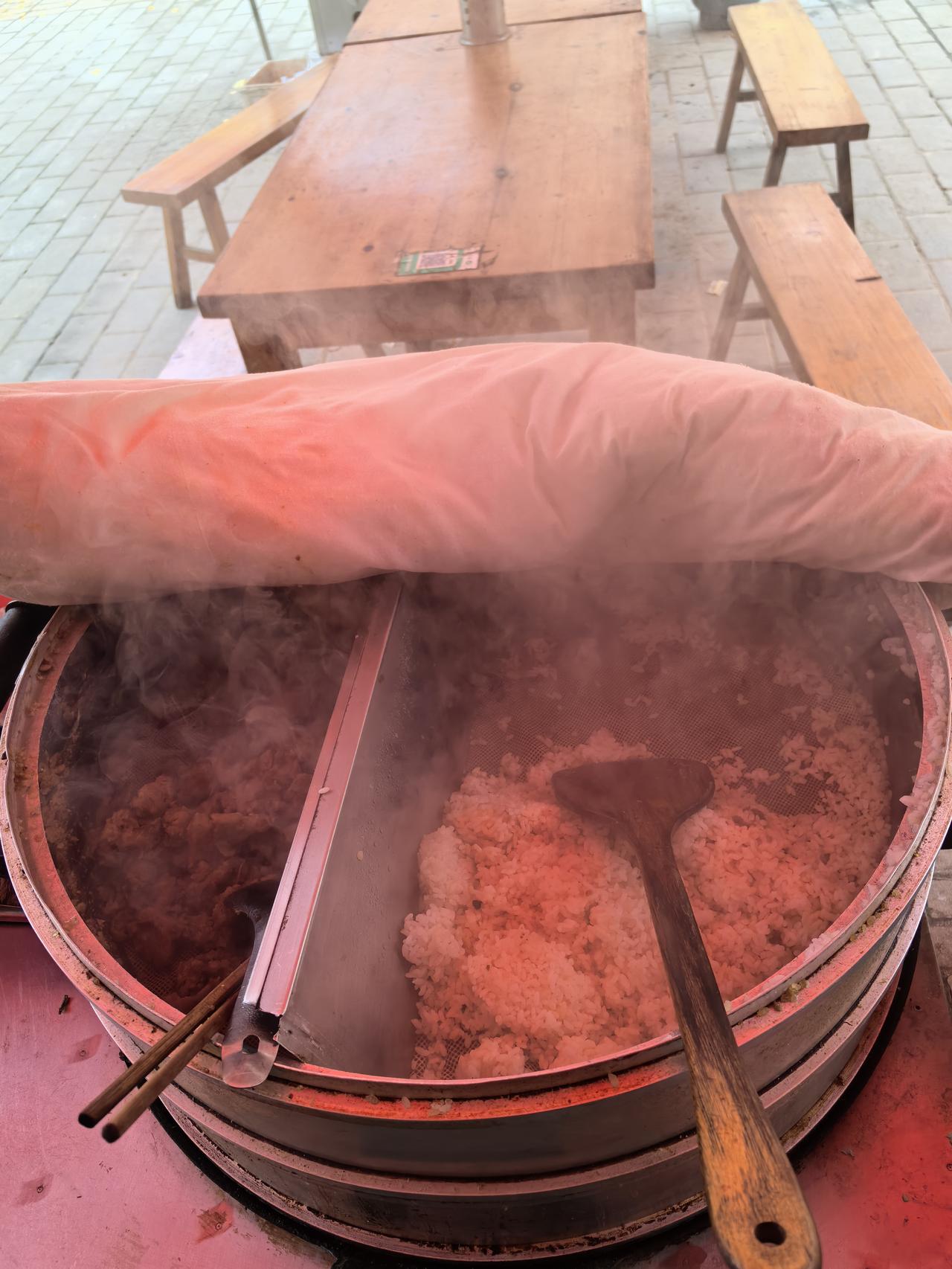 闲来无事来哑柏镇逛一圈,此行主要目的是为了那一口粉蒸肉,哑柏是周至西边的重镇,城镇规模很大,街道两边商铺林立,今天不知道是否逢集,但是街道上摆摊的很多,瓜果、蔬菜、烤烟、百货应有尽有,热闹程度感觉不亚于陕西好多小县城。 粉蒸肉是哑柏镇的一大特色,一个城镇,据我粗略估计卖粉蒸肉多的店不低于十家,当地的粉蒸肉和米饭一块上蒸锅,有的是分开蒸,有的是把大米铺在肉下面,这样蒸熟的时候,大肉的油渗入米饭,米香里面混合了肉香,当地人吃法,一碗肉就着米饭吃,小菜自取,有雪里红、芥疙瘩、凉拌红萝卜等,吃肉同时,小菜解腻,味美可口。 从周至哑柏到眉县青化,都是这种吃法,当地人都是粉蒸肉配米饭,这一点与关中其他地区面食为主还是有差别的,我猜测可能在这块区域以前有种植水稻的习惯。