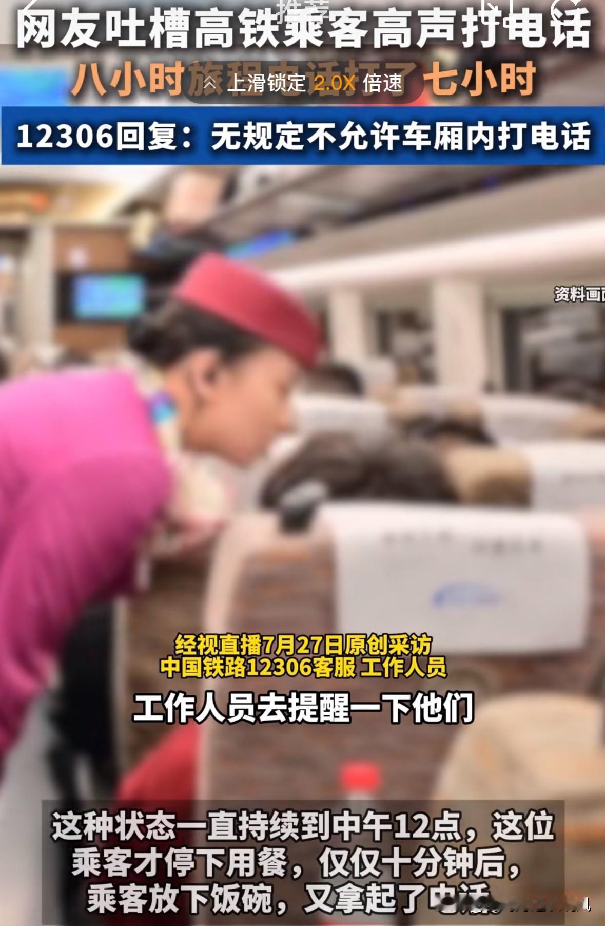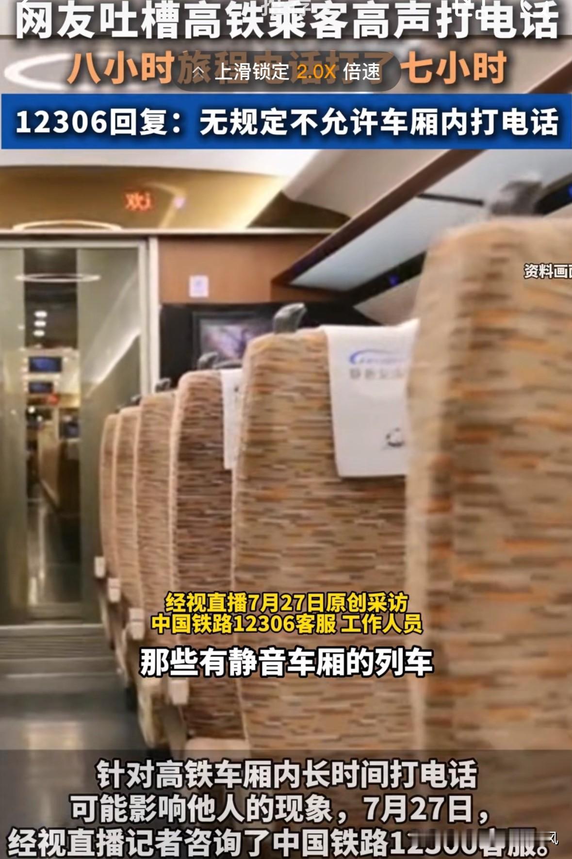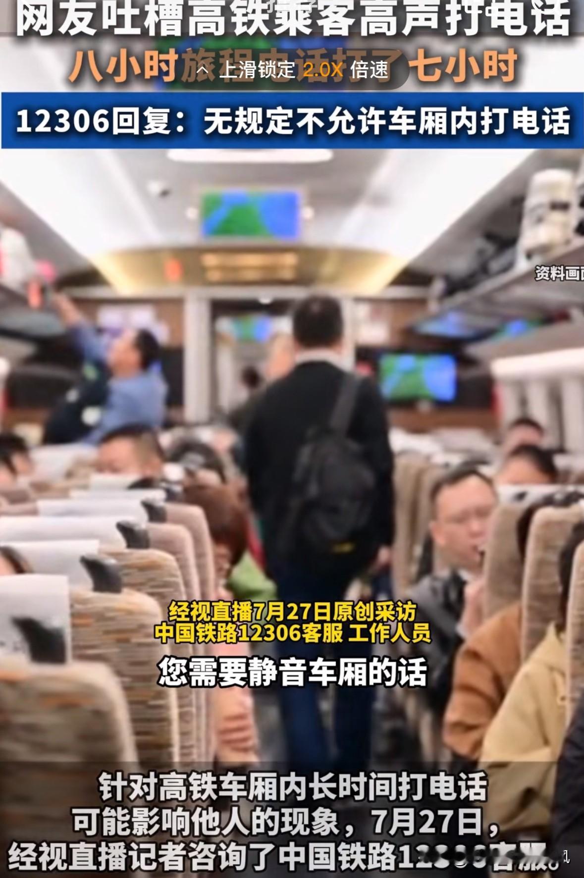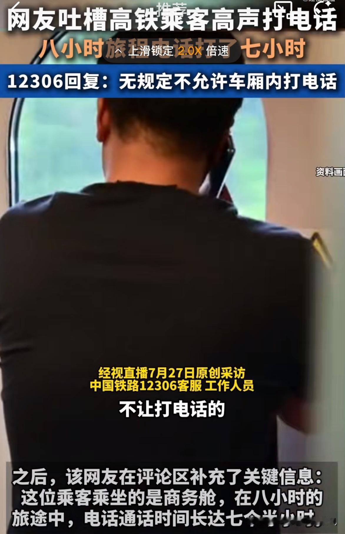 高铁商务舱有人打7个半小时电话!12306:没规定禁打,但可以… 7月25日有网友吐槽:坐高铁碰到“电话狂魔”,8小时行程对方打了7个半小时!从早八点半上车就边听下属汇报边指挥,中午吃饭只歇10分钟又接着打,还是商务舱! 这事吵翻后,12306回应了:铁路没条款禁止车厢内打电话。要是觉得被吵到,找乘务员提醒对方小声点,但乘务员没法强制让人挂电话。想清净?建议买票时选“静音车厢”,不然碰上这种情况,只能忍… 如今高铁里碰到大声打电话的,真没辙?不少网友喊着该出细则管管,你咋看?