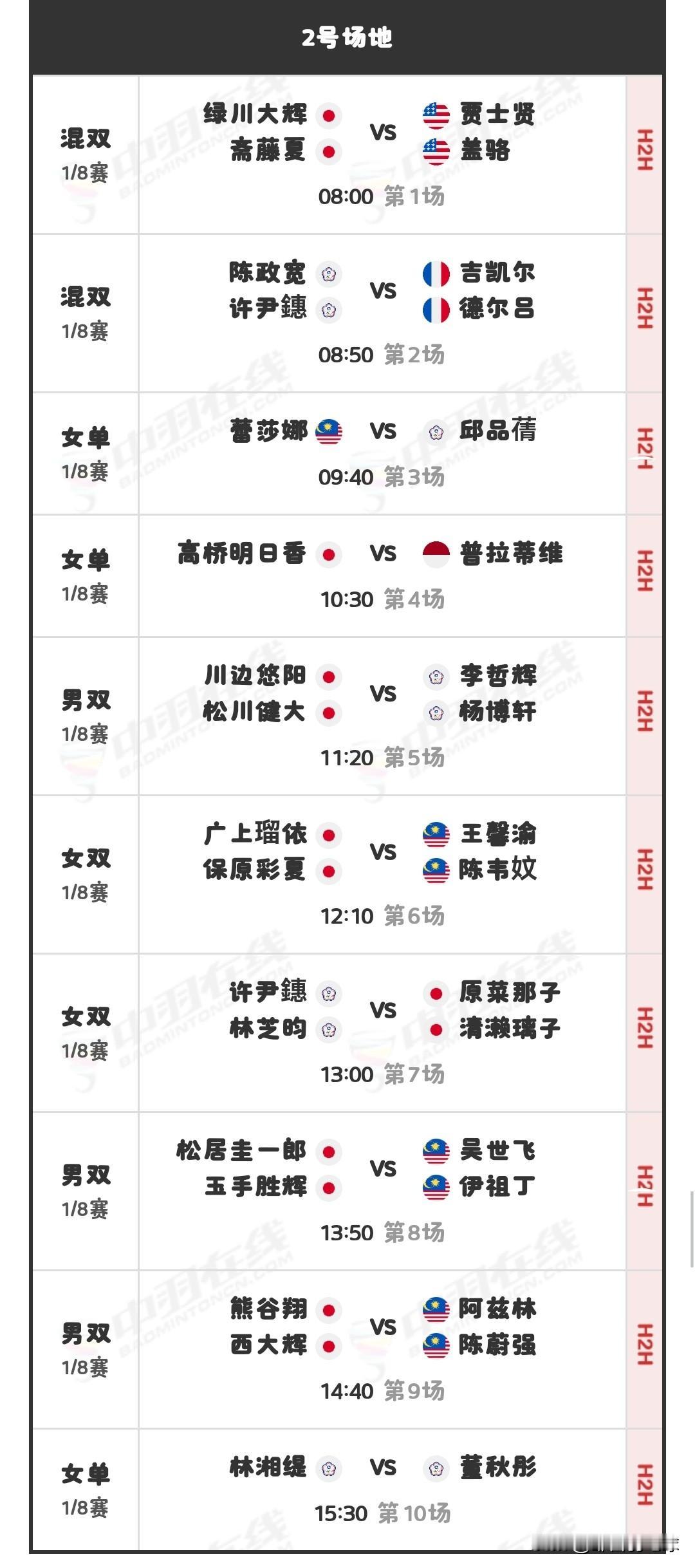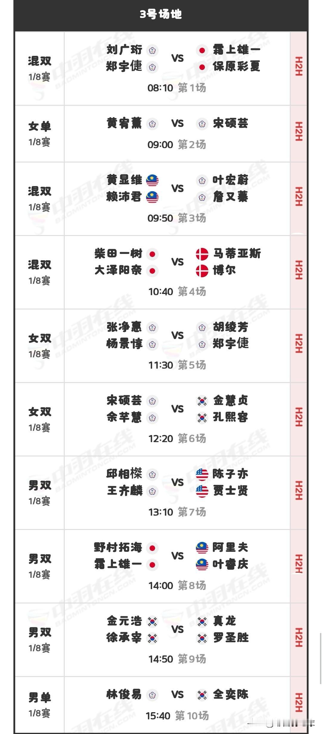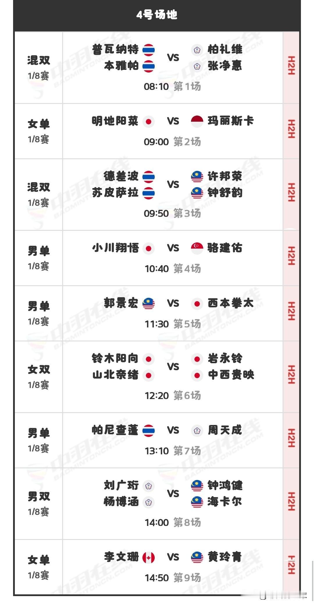 11月13日日本羽毛球大师赛1/8决赛赛程 今日赛事已全部收官,历经两日鏖战,首轮比赛圆满落幕。 明日北京时间08:00将开启1/8决赛,届时四块场地将同时开赛,对阵分别为郑加恒对战拉克什亚、王子维对战法汉,具体对阵安排如下: 羽毛球 羽毛球爱好者 羽毛球比赛 羽毛球赛事 羽毛球大师赛