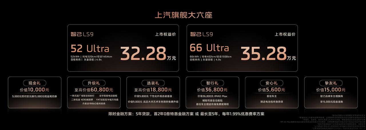“上汽旗舰大六座”智己LS9正式上市~ 新车推出两款配置版本:52 Ultra版售价32.28万元,66 Ultra版售价35.28万元,预计将于11月下旬启动交付。 新车基于800V架构打造,搭载"恒星超级增程"系统,采用1.5T增程器与前后双电机组合,系统综合功率390kW,峰值扭矩670N·m,零百加速成绩进入4秒级。续航方面,高配版本CLTC纯电续航达402km,综合续航1508km,官方公布的亏电油耗为2.81L/100km。 底盘系统是LS9的技术亮点,搭载灵蜥数字底盘3.0,配备双向24°四轮转向系统,使其转弯半径控制在4.95米。同时配备150mm行程双腔空气悬架与CDC电控阻尼系统,并针对电动车特点开发了"舒享防晕模式"。 智能配置方面,全系标配520线超视域激光雷达与英伟达Thor芯片,支持IM AD Max辅助驾驶系统,具备交通手势识别功能。座舱内配备多屏交互系统,并集成AI Agent语音助手。 车身尺寸方面,LS9长宽高分别为5279/2000/1806mm,轴距达3160mm,采用2+2+2六座布局。配备4D机械按摩座椅、B&O音响系统等舒适性配置,并可选装支持24小时热水供应的野奢户外套装。【来自懂车帝车友圈】