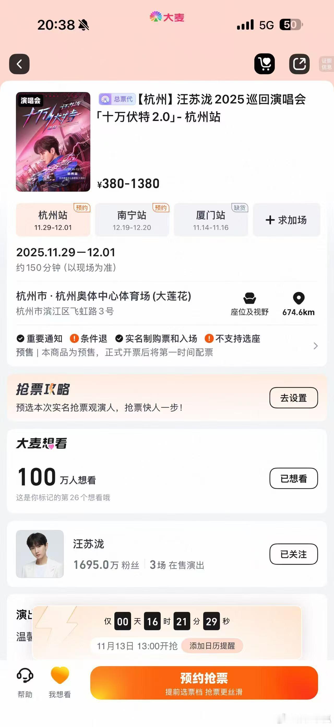 破百万想看太震撼!汪苏泷杭州演唱会预售明日1点开启,国民度毋庸置疑,拼尽全力也要抢票,圆一场奔赴的梦🥹