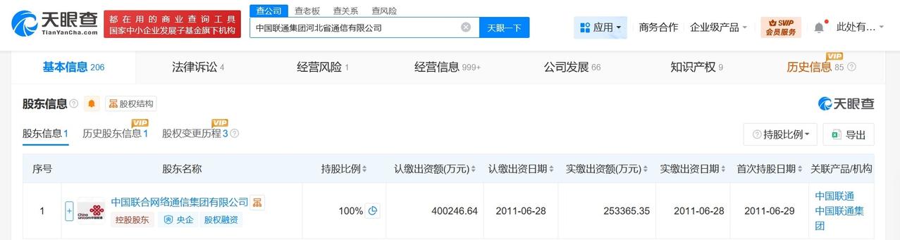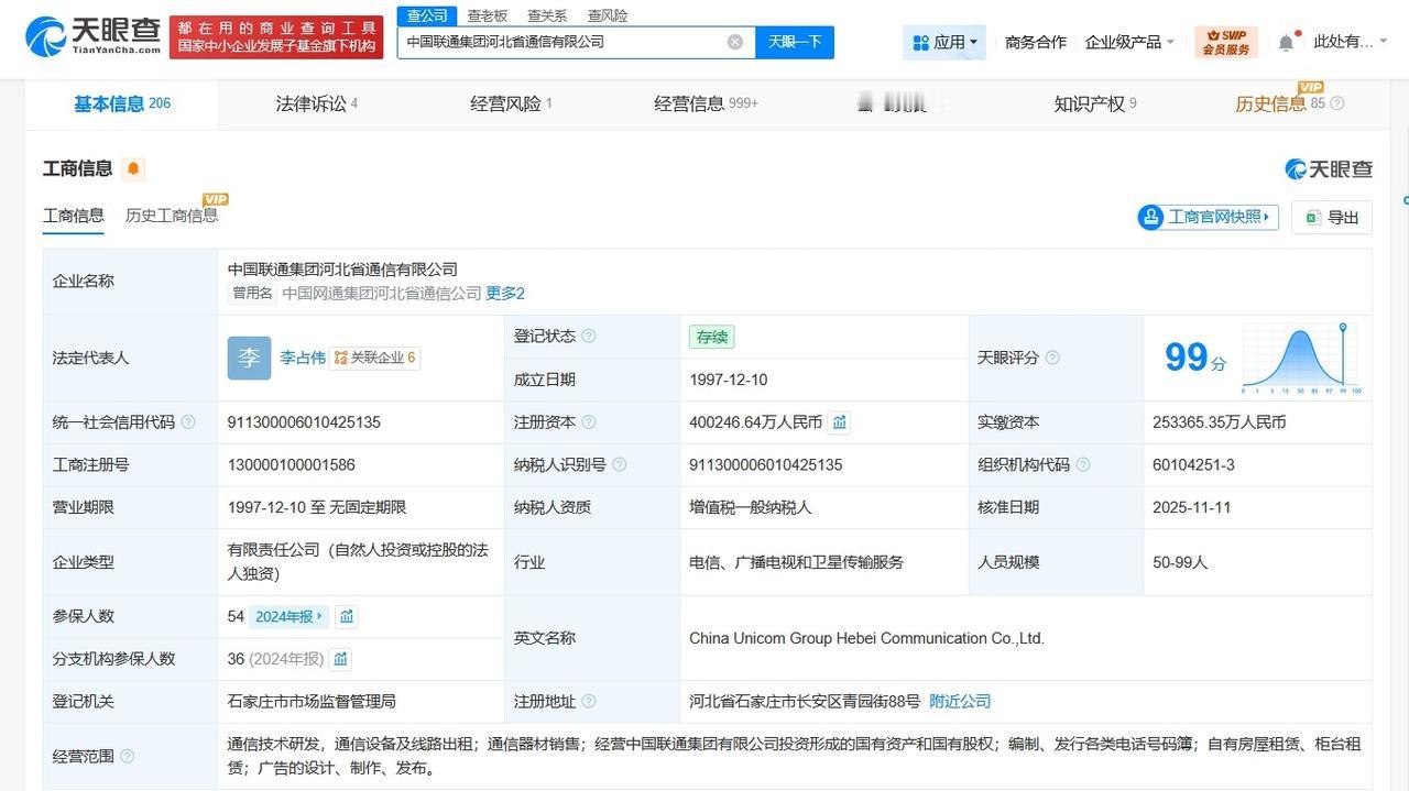 中国联通集团河北通信公司增资至40亿增幅约58% 天眼查工商信息显示,近日,中国联通集团河北省通信有限公司发生工商变更,注册资本由约25.3亿人民币增至约40亿人民币,增幅约58%。 该公司成立于1997年12月,法定代表人为李占伟,经营范围为通信技术研发、通信设备及线路出租、通信器材销售、经营中国联通集团有限公司投资形成的国有资产和国有股权等。股东信息显示,该公司由中国联合网络通信集团有限公司全资持股。 天眼查信息: