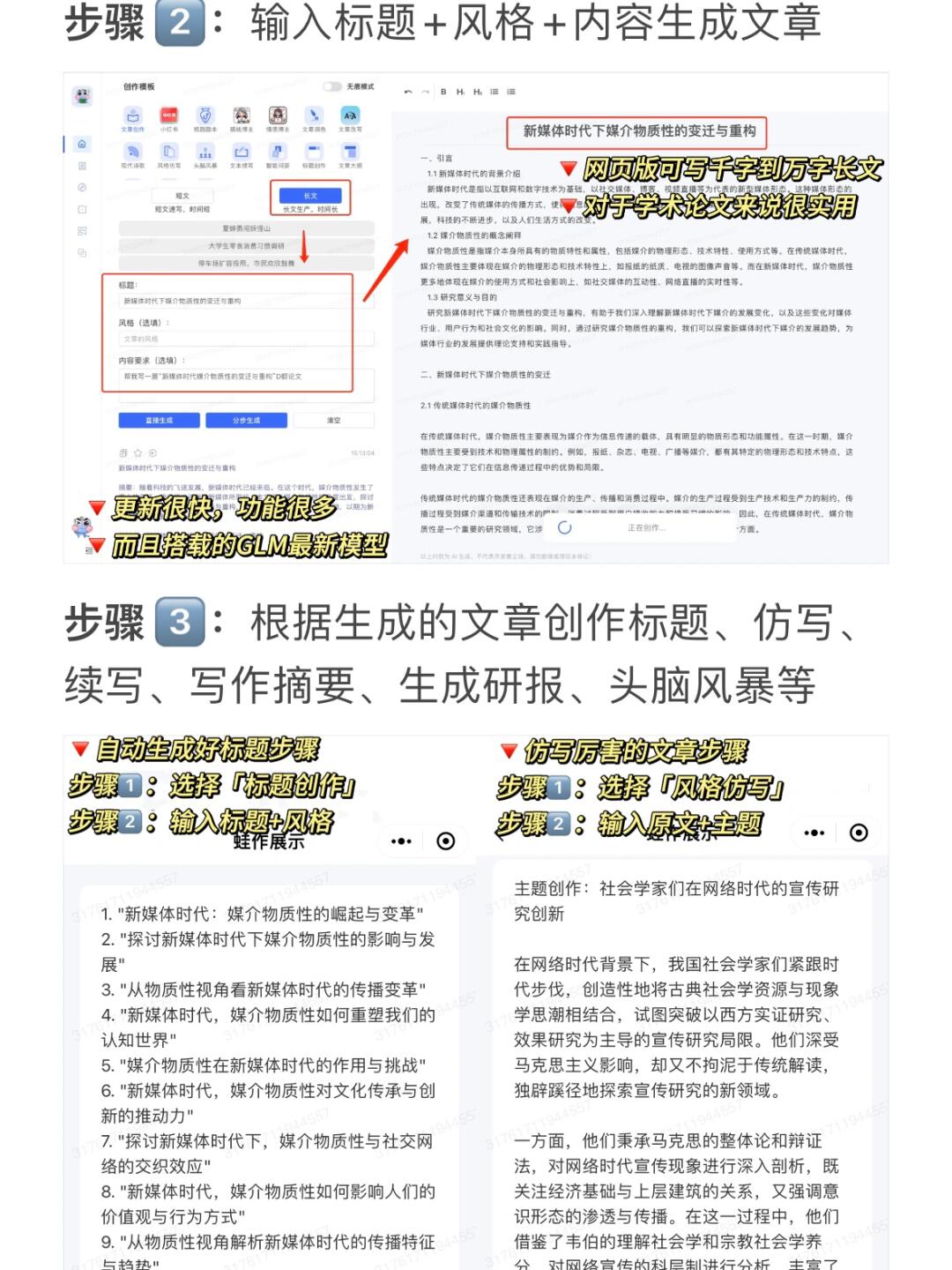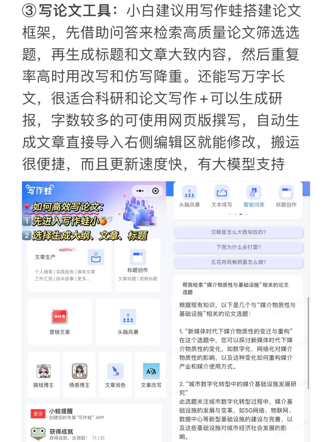 小白建议用写作蛙搭建框架,并大量阅读文献,描述需求辅助了解选题等信息,还可以试试生成研报功能。如果字数多的长文就用网页版,导入右侧编辑区修改修改很便捷,更新速度快,还有大模型支持