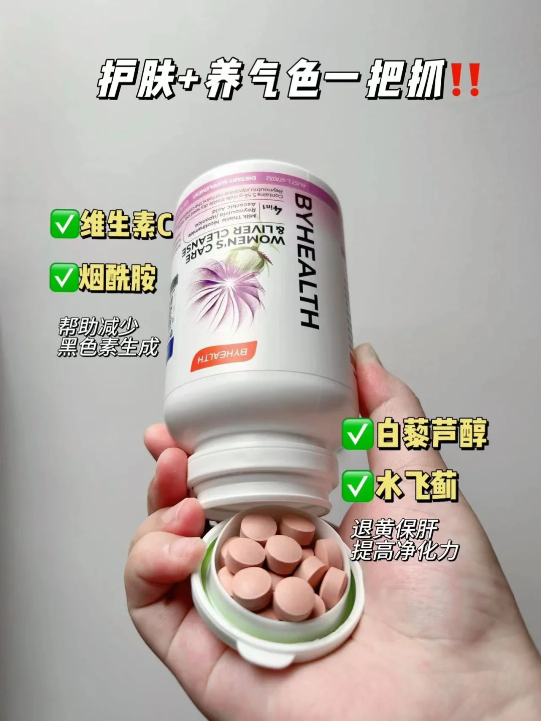 还可以试试Byhealth汤臣倍健白月光护肝片,这是专门女孩子研制的护肝片。里面含有水飞蓟+白藜芦醇,可以提高肝脏代谢能力,还可以退黄保肝❗重点是里面还有维c和烟酰胺可以帮助减少和抑制黑色素生成,养颜先养肝可不是说说而已,护肝的同时养气色,让你从内而外的状态越来越好✅整个人都变得更阳光了,平时总爱熬夜,脸黄气色差的姐妹真的可以试试!