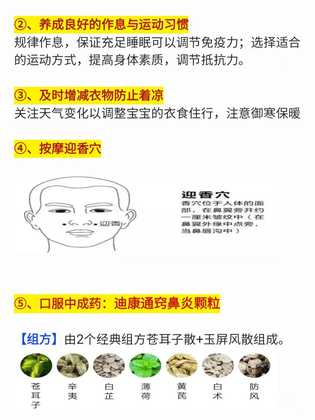 “以上图片收集了一些调理过敏性鼻炎的法子供大家学习参考,想要进一步针对鼻炎治疗的,也可以选择对症用药,比如迪康通窍鼻炎颗粒,既方便服用,又易于坚持,能有效的减少儿童过敏性鼻炎复发