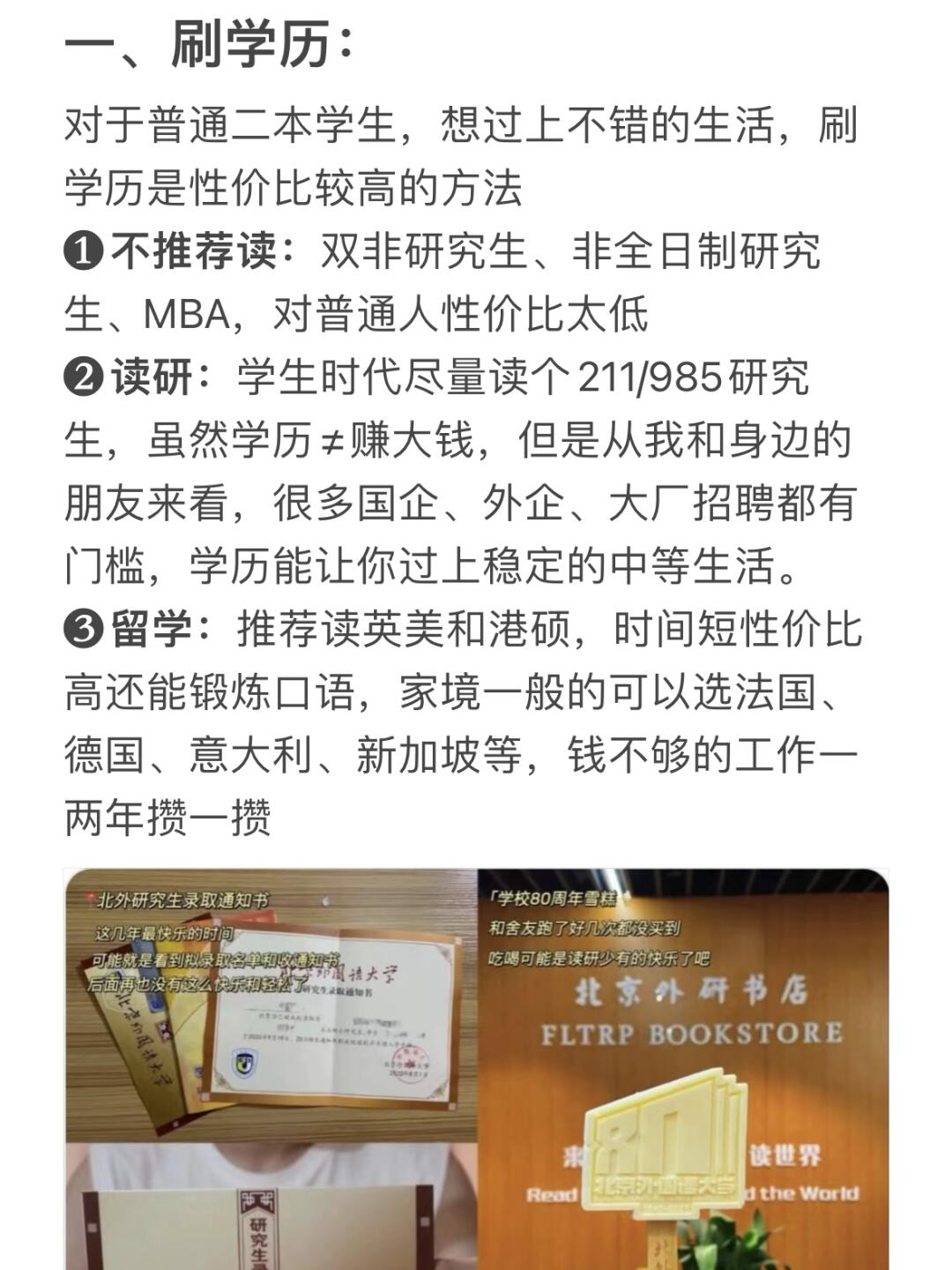 ❶普通文科生报志愿/考研:①原则是学校>城市>专业,读双非研究生不值得。如果能去985和211就别犹豫,名校仍然是国企/外企和大厂门槛。