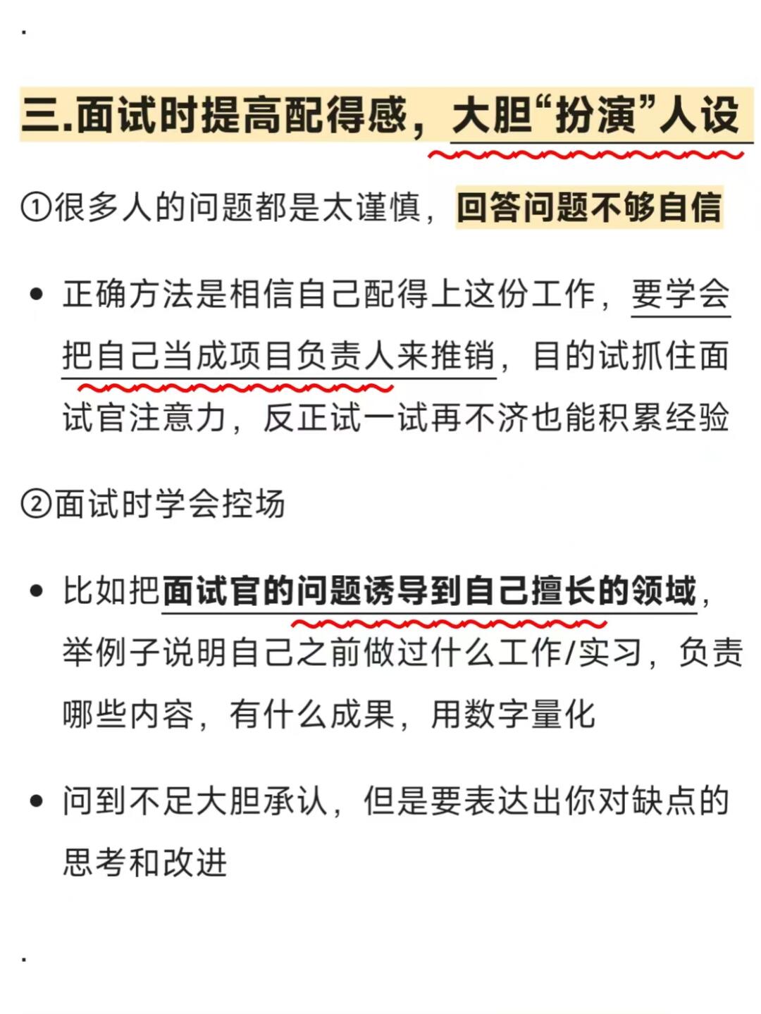 ①面试时很多人的问题是太谨慎、回答不自信,我的秘诀是相信自己配得上这份工作,学会把自己当成项目负责人来推销,目的是抓住面试官注意力,反正再不济也能积累经验