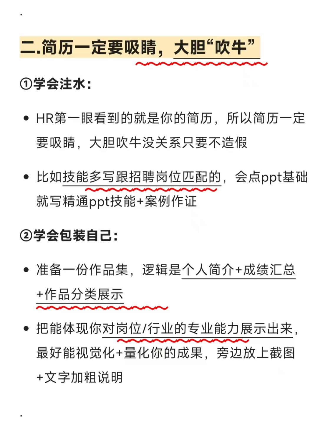 ①学会注水:HR第一眼看到的就是你的简历,所以简历一定要吸睛,大胆吹牛没关系只要不造假。比如技能多写跟招聘岗位匹配的,会点ppt基础就写精通ppt技能+案例作证