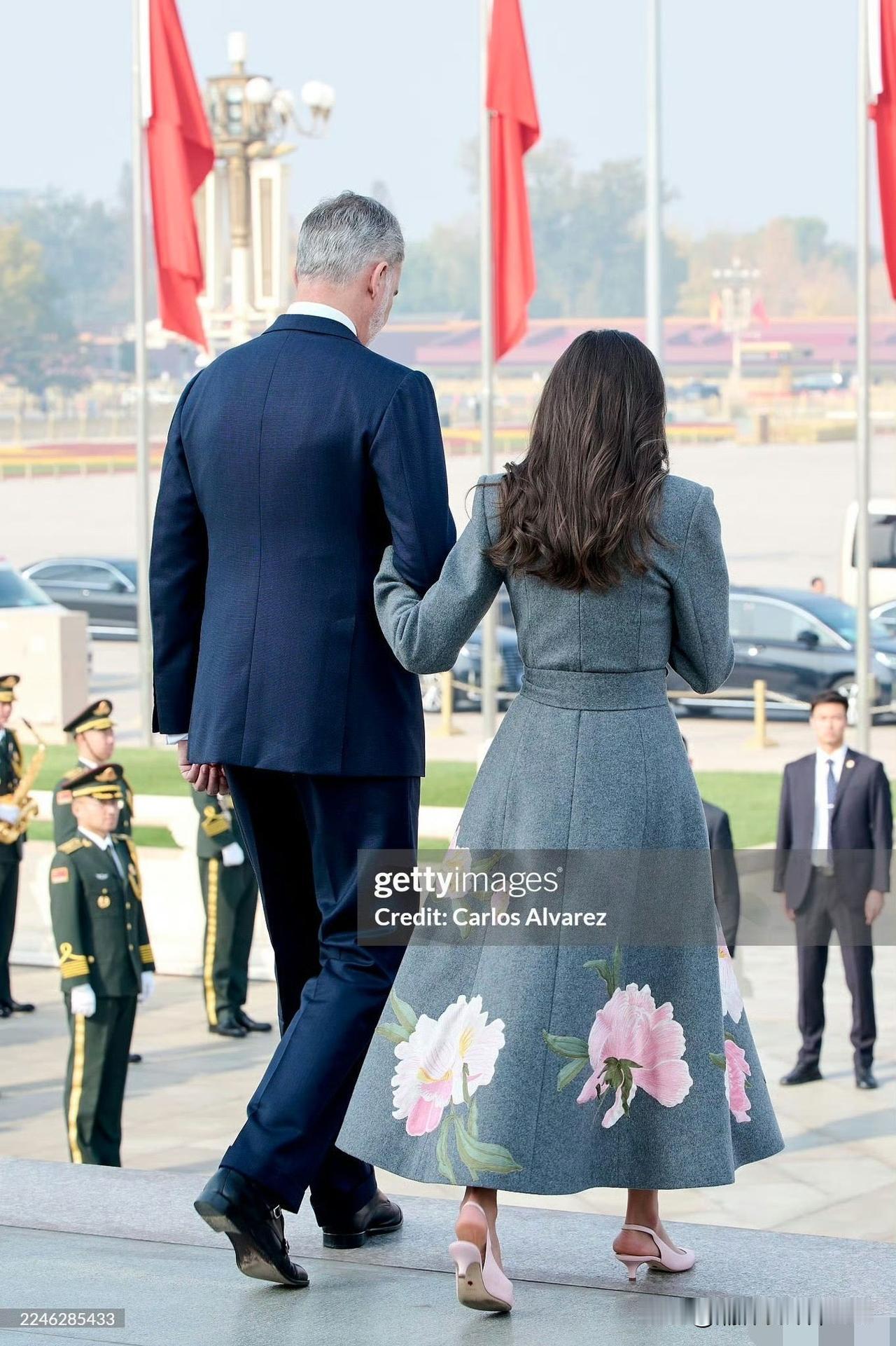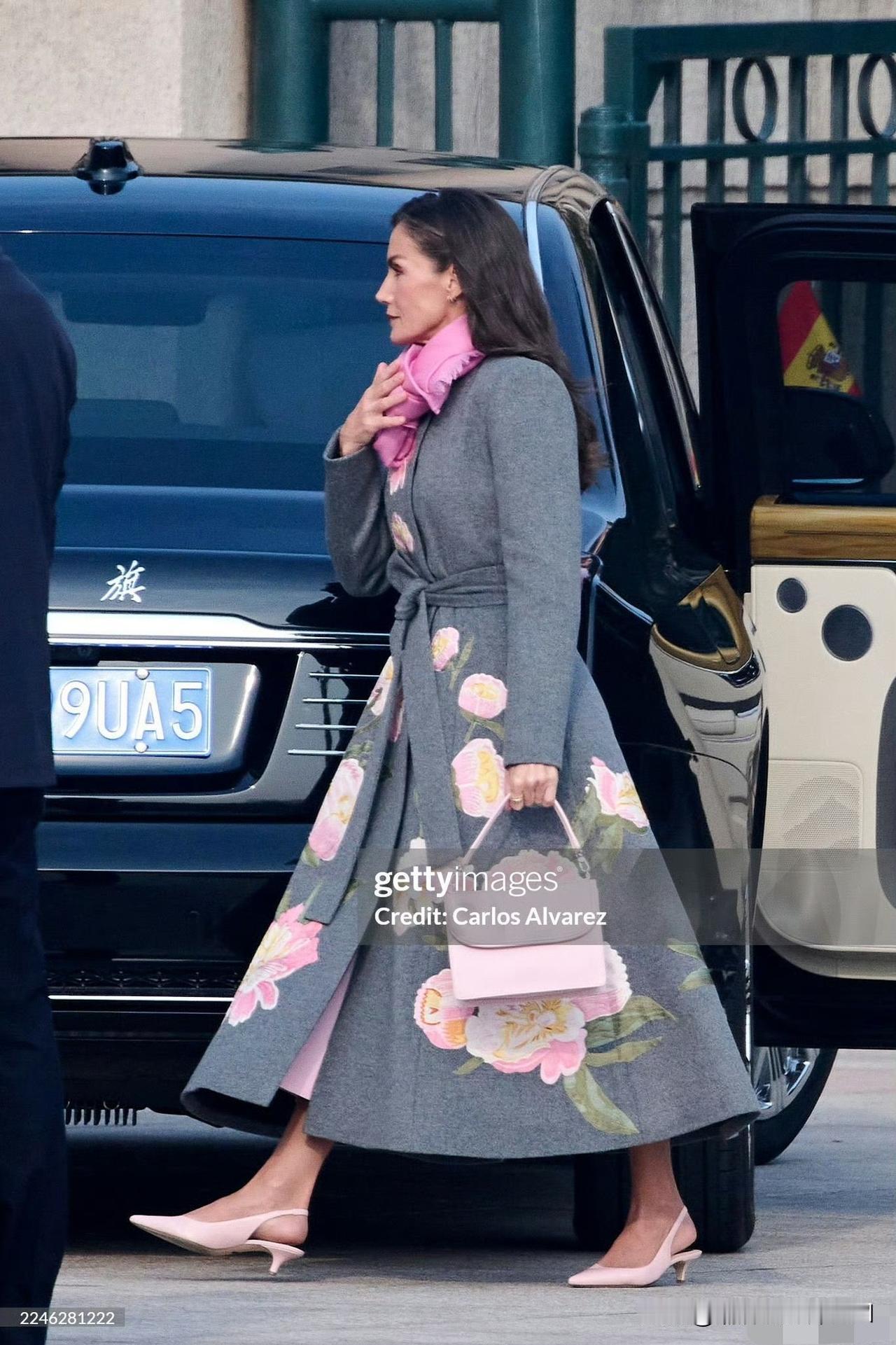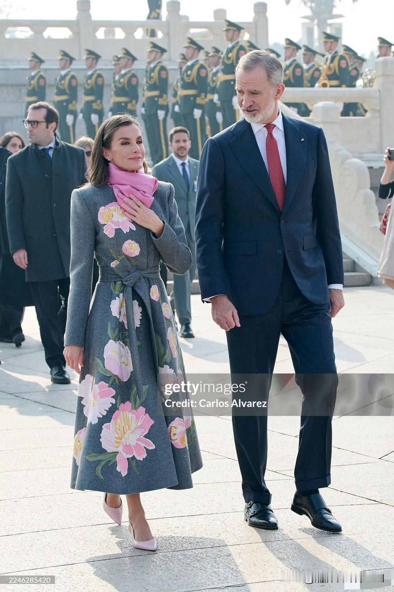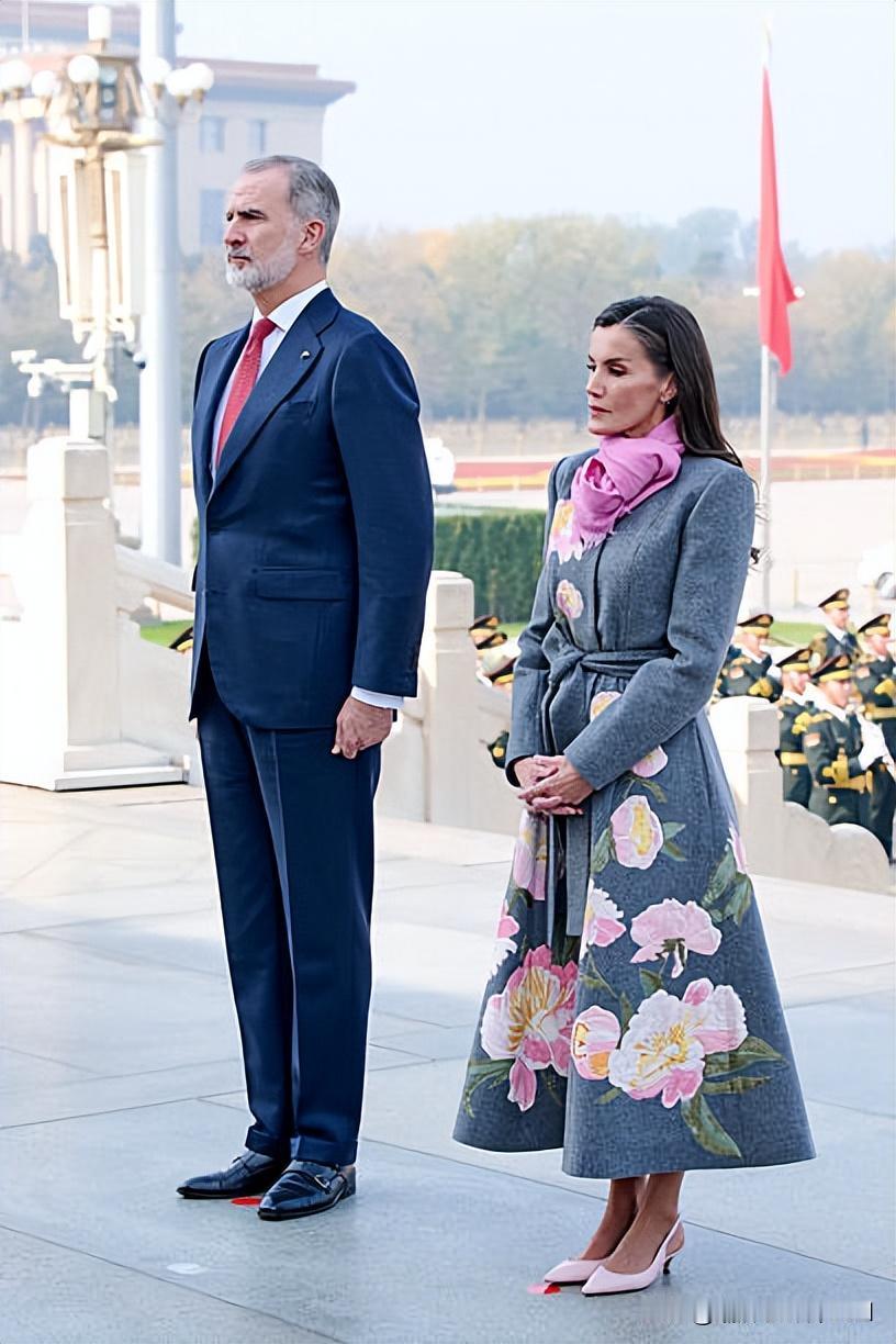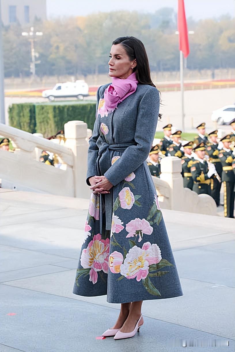 莱后在天安门广场的新中式着装,好讲究色彩搭配啊!端庄大气,高雅有范,完美彰显出一国之后的风范~ 近日,西班牙国王访问中国,特意携莱蒂齐亚王后向人民英雄纪念碑敬献花圈!讲真,不愧是“欧洲最美王后”,虽已年过半百,但一袭简约大气的灰色印牡丹花大衣,配上淡粉色羊毛围巾和长裙,却展现出了典雅不失时尚的风范! 配饰上,莱后也没有选择戴很复杂奢华的款式,虽只是一对素雅精致的银色耳环,却好衬她的气质!脚踩裸粉色尖头小高跟,走起路来高雅有范,仪态气质太出众!而这样的莱后,真的好美!