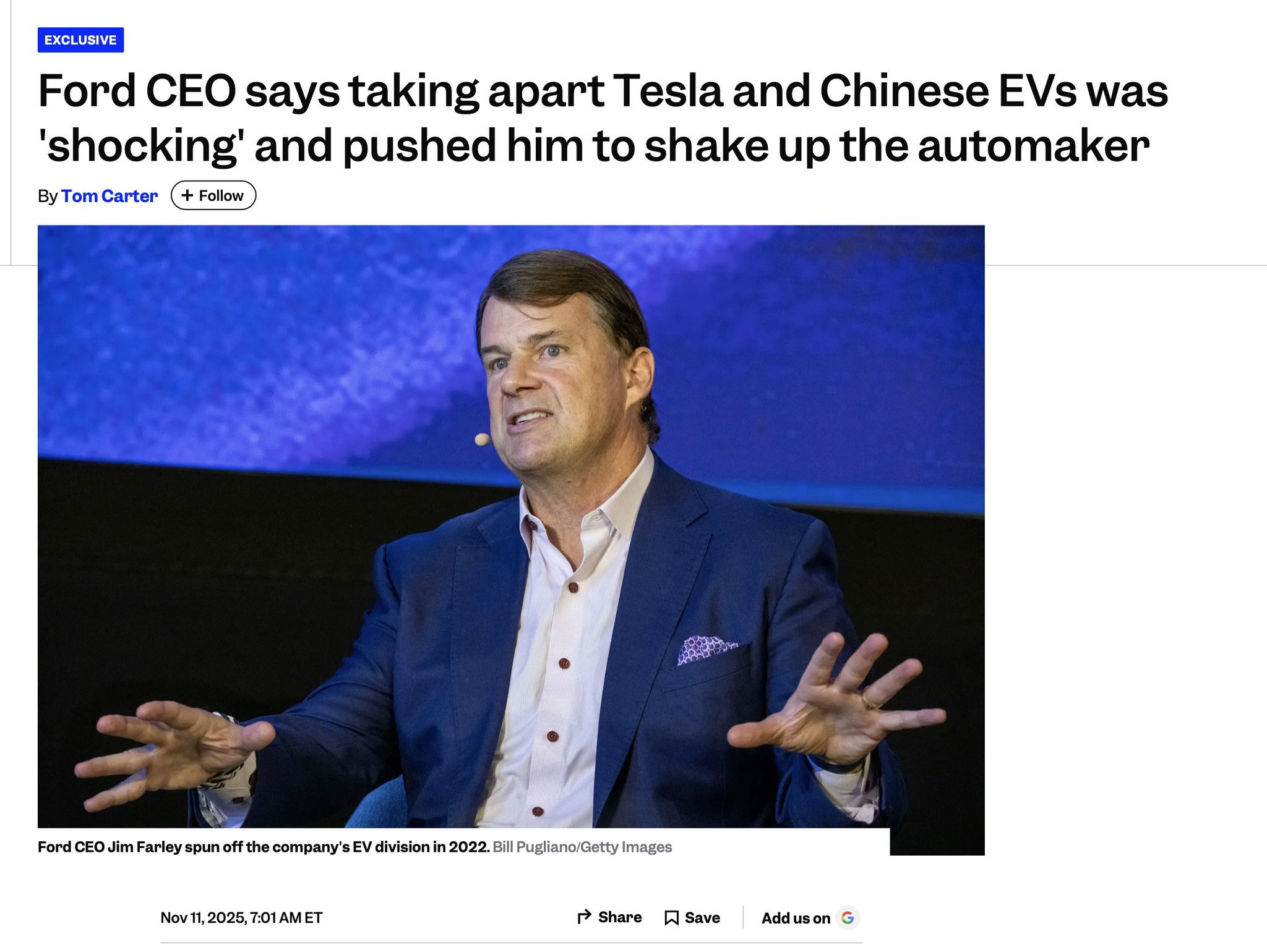 传统汽车大亨又在“复盘”了。福特CEO吉姆·法利(Jim Farley)近日在采访中坦言,拆解特斯拉Model 3后感到“惭愧”。他发现,福特Mustang Mach-E的电线比Model 3多出约1.6公里,导致车重增加,还需要搭载更大、更贵的电池。这一对比让他意识到,公司必须做出改变才能跟上新竞争对手的步伐。吉姆·法利强调,面对中国电动车企的迅速崛起,福特绝不能“放弃电动车”。这场电动化转型的竞赛,正倒逼传统车企加速自我革新。