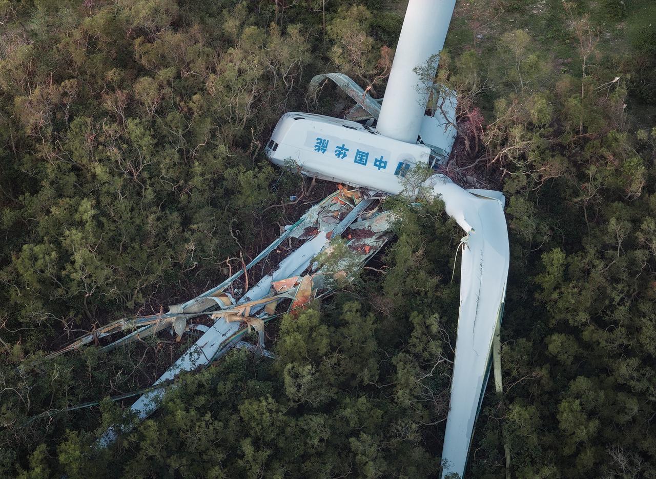 广东湛江,台风“桦加沙”席卷过后,华能雷平风电场5台风力发电机倒塌,图为倒塌的风车融入了山顶的树林之中。 该电场于2012年建成运行,采用陆上风电1.5兆瓦机型,单机容量较小,其叶片长度、塔筒高度等参数均低于当前主流陆上风机水平,本次风电场实录最大风速达到75米/秒,远超风机当年设计标准极限。 拍摄:大疆御4Pro