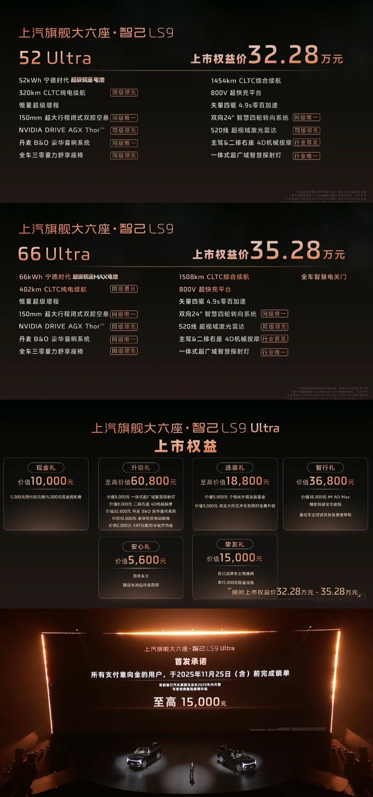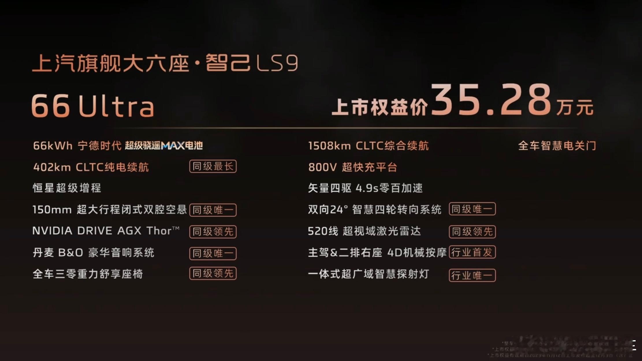 上汽旗舰智己LS9 正式上市价格来了- LS9 52 Ultra: 32.28万,- LS9 66 Ultra: 35.28万,(预售价: 33.69-36.69万元)这一次有比较好的点是,标配的配置有150多项,也就是 LS9 全系 Ultra,区别主要就是电池容量,这个主要看续航和补能。