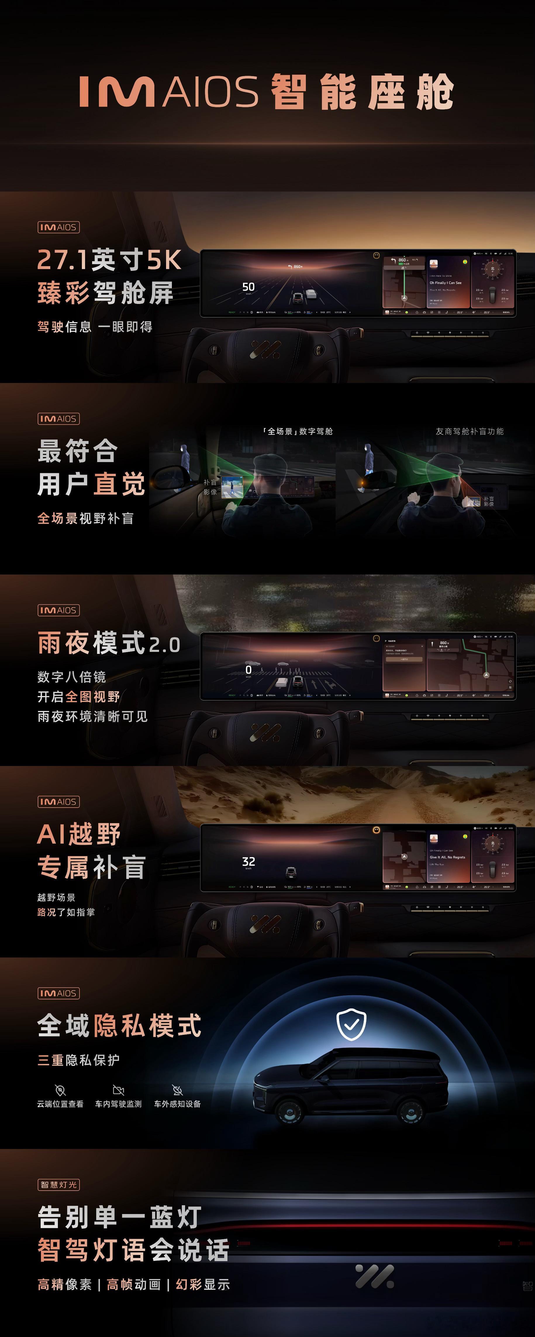 上汽旗舰 | 智己 LS9 | 产品大总结:首先,整车底盘搭载灵蜥数字底盘 3.0,具备同级唯一双向 24° 智慧四轮转向系统,转弯半径仅 4.95 米,配置 150mm 超大行程双腔闭式智慧空气悬架与智能电控阻尼调节系统,由灵蜥智能控制中枢统一协调,可实现更低侧倾与更稳操控,全域协同控制舒享防晕模式可进一步降低侧倾 56%。驾控方面,LS9全系配备灵蜥矢量四驱系统,具备多场景越野能力,可应对乱石路、驼峰路、高台攀登等复杂地形。配合 AI 越野补盲系统,实时呈现车身周围环境信息,提升越野安全性与可控性。动力方面,智己 LS9 搭载智己恒星超级增程系统与 800V 双电机矢量四驱平台,零百加速约 4 秒。配备与宁德时代联合开发的超级骁遥电池,支持 402 公里 CLTC 纯电续航与 1508 公里 CLTC 综合续航,全系匹配上汽首创 1.5T 增程专属超效黄金发动机,采用保时捷同源可变截面涡轮增压器,可在高原保持稳定输出,能耗折算低至 2.81L/100km,支持 92 号汽油。冬季环境下,LS9配备增程一体式热管理架构,-20℃ 时电量可维持常温状态的 95%,并支持 170kW 超快充,配备 ERNC 2.0 主动降噪系统,增程器介入时二排噪音增量为 0 分贝。智能驾驶部分,智己 LS9 全系搭载 520 线超视域激光雷达与英伟达 Thor 芯片,700 TOPS 算力,系统由智己与 Momenta 联合开发的 IM AD Max 方案提供支撑,具备多模态感知能力,可识别交通手势、施工区域、高速并道等复杂场景。一键 AI 代驾功能支持贴边、脱困、循迹等多种操作。升级版超感 AEB 系统可提前识别碰撞风险,基于端到端大模型的 AES 横向紧急避让策略,能够实现连续制动与避障控制。 安全方面,智己 LS9 采用灵蜥爆胎稳定控制系统,联动四轮转向与线控制动,提升爆胎状态下的车辆可控性;主动防侧翻 3.0 技术可将侧翻风险降低最高 54%;车身结构为十纵十一横潜艇笼式设计,采用潜艇级热成型硼钢,并配备三重冗余开门安全机制;电池部分搭载宁德时代超级骁遥电池,具备航空级安全标准与多重防护设计。 智能座舱,采用 27.1 英寸 5K 臻彩驾舱屏,支持 A 柱补盲影像、雨夜模式 2.0、DZT 动态区域追踪 2.0,以及全新 AI 越野补盲功能,确保驾驶信息全面可视,引入 AI Agent 智能助理,可通过语音完成多项车内操作,提升使用便利性。全域隐私保护体系覆盖云端数据、车内画面与整车感知三重防护,保障个人隐私安全,幻彩智慧灯语 2.0 在不同场景下可实现多样化灯光展示,增强交互与仪式感。豪华设计与空间方面,车辆采用 3160mm 超长轴距与 2.4 米贯穿式灯带,搭配 Skyline 2.0 尾灯与超维广角尾门,提供更高便利性,提供波罗蒂蓝、奥林匹斯黑、高加索灰、乔戈里银四种车色,以及三款轮辋选择,内饰采用大地象灰深浅双色主题,结合皇家礼赞艺术木纹饰板、加尼叶金饰与巴洛克渐变浮雕珩缝,呈现高端质感,车内还配备智能沉浸氛围灯,全车灯光可随音乐律动变化,得房率达 86%,四人舒享模式下二排空间超越 MPV,三排具备 143° 躺姿,配备三把零重力座椅。在舒享与健康体验上,智己 LS9 搭载与丹麦音响品牌 B&O 联合打造的 25 扬声器 7.1.4 声道音响系统,也是 B&O 在中国汽车品牌的首次应用;并配备行业首创 4D 车规级机械按摩系统,可模拟专业按摩师手法。全系标配瞬净新风系统,每小时可完成 400 立方米换气,使用 CN95 级活性炭滤芯过滤空气污染,车内智控地暖系统可自下而上均匀升温,提升冬季舒适度。在户外与拓展功能上,LS9提供野奢户外套装与专业拖挂系统,拓展户外生活使用场景。一体式超广域智慧探射灯照明面积达 8000㎡,满足露营及夜间户外使用,前排智慧中岛支持 IM MAG 磁吸拓展坞与随心贴配件。