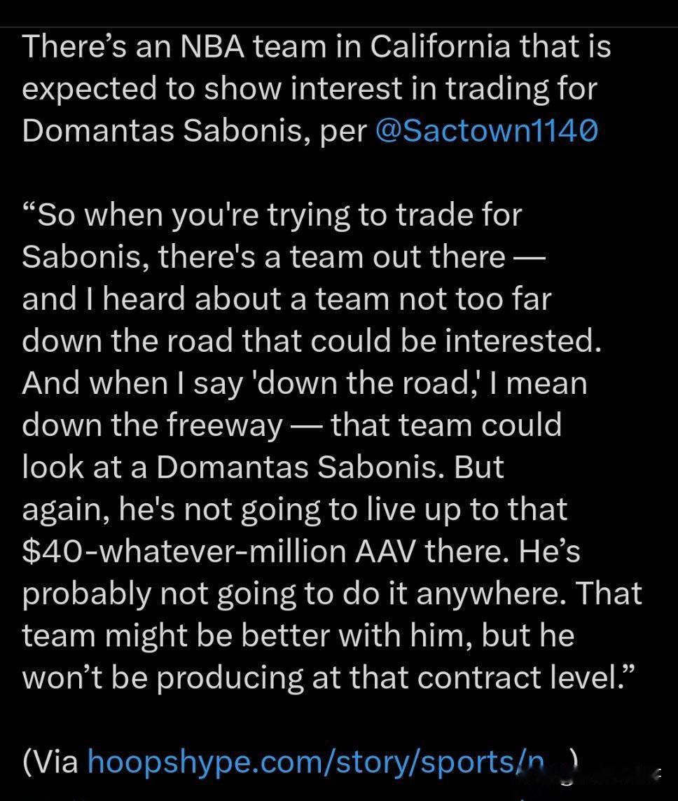 说的是哪支球队???位于加州的一支球队有意交易得到萨博尼斯! 国王已经到了崩溃边缘,昨天他们又输了,当然输给掘金并不可怕,毕竟不是一个等级的球队,但是他们已经很久没有连续赢球了,连败反而是常事。 目前国王已经考虑交易萨博尼斯、拉文和德罗赞,显然拉文是最难出手的,最容易也是最有机会出手的就是小萨,目前外媒Sactown Sports 1140发布最新消息,位于加州的一支球队对小萨很感兴趣,他们可能会考虑交易得到这位全能型内线。 据详细信息透露,这支加州球队距离萨克拉门托非常近,近到都不用坐飞机,走高速很快就到了,这是点名了哪支球队呢,加州就那么四支吧…… 如果说小萨以前也是个三双达人,那么本赛季他一定不是最好的那个他,之前他现在的数据大幅下滑,也可能是目前国王的阵容无法发挥他最大的作用,不行就挪挪窝! 国王新赛季 国王队 萨博尼斯 国王队球星