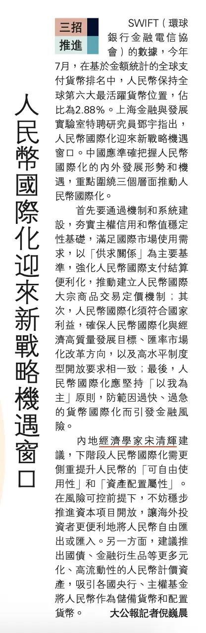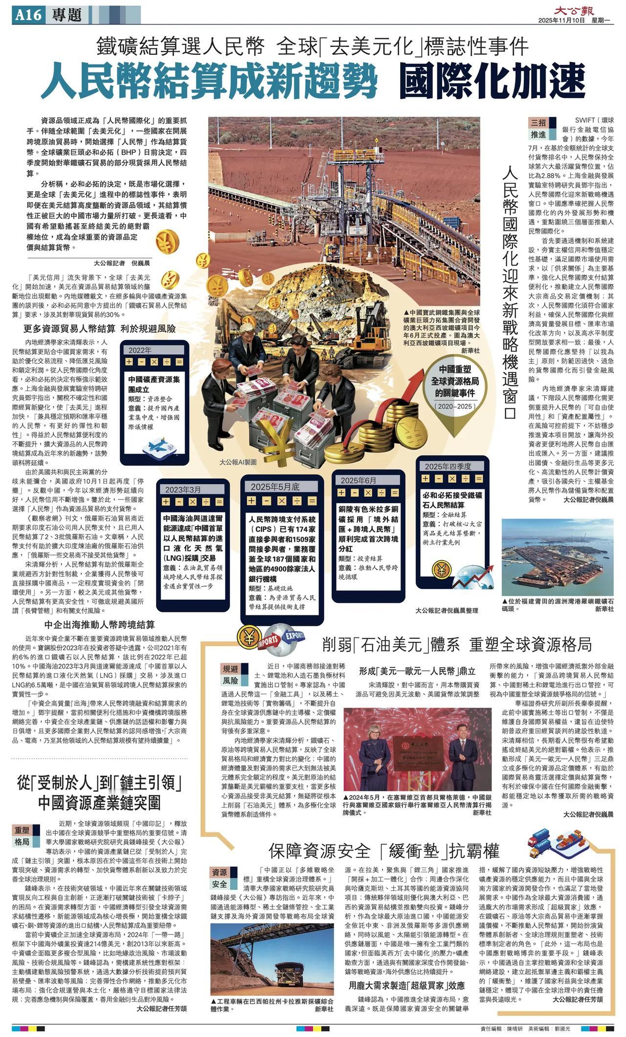 人民币结算成新趋势,国际化加速。人民币国际化 据大公报,资源品领域正成为“人民币国际化”的重要抓手。伴随全球范围“去美元化”,一些国家在开展跨境原油贸易时,开始选择“人民币”作为结算货币。全球矿业巨头必和必拓(BHP)日前决定,四季度开始对华铁矿石贸易的部分现货采用人民币结算。 内地经济学家宋清辉表示,人民币结算更贴合中国买家需求,有助于优化交易流程、降低汇兑风险和锁定利润。从人民币国际化角度看,必和必拓的决定有极强示范效应。 宋清辉分析,人民币结算有助于俄罗斯企业规避西方针对性制裁,企业获得人民币后可直接采购中国商品,一定程度实现资金的“闭环使用”。另一方面,较之美元或其他货币,人民币结算有更高安全性,可彻底规避美国所谓“长臂管辖”和有关支付风险。