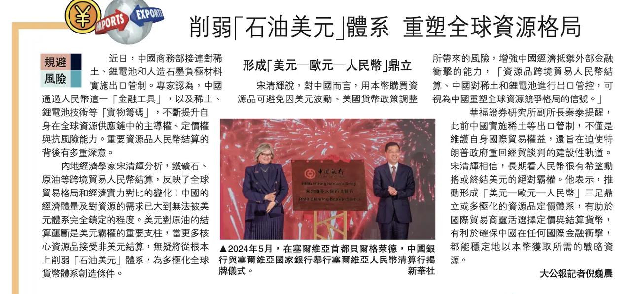 人民币结算成新趋势,国际化加速。人民币国际化据大公报,资源品领域正成为“人民币