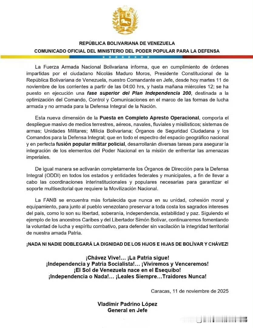 美国”福特号“航母战斗群很快将抵达加勒比海海域。 随着美国入侵威胁越来越严重, 11月12日,委内瑞拉国防部发布全国总动员令。 全文: 委内瑞拉玻利瓦尔共和国 人民权力国防部官方公告 玻利瓦尔国家武装部队通报,为执行委内瑞拉玻利瓦尔共和国宪法总统尼古拉斯·马杜罗·莫罗斯阁下——我们的最高统帅——下达的命令,自今日(2025年11月11日,星期二)凌晨4:00起,至明日(11月12日,星期三),我国已启动《独立200计划》的高级阶段,旨在优化国防综合斗争形式框架下的指挥、控制与通信系统,以保障国家综合防御。 这一作战准备全面部署的新阶段,将大规模投入陆地、空中、海军、内河及导弹部队;武器系统;军事单位;玻利瓦尔民兵;公民安全机构及综合防御指挥部。这些力量将在全国地理空间的全频谱范围内,以军警民完美融合的模式,开展各类任务,确保国家权力要素整合,从而应对各类重大威胁。 与此同时,全国各联邦州、市的综合防御指挥机构(ODDI)将全面启动,以开展必要的机构间及民众协调工作,保障全国动员所需的多部门支持。 玻利瓦尔国家武装部队(FANB)在团结、道德凝聚力和装备方面从未如此强大。我们将与委内瑞拉人民一道,不惜一切代价捍卫国家的神圣利益,如自由、主权、独立、稳定与和平。我们将以加勒比先辈和解放者西蒙·玻利瓦尔为榜样,继续弘扬战斗意志和拼搏精神,毫不动摇地捍卫我们玻利瓦尔祖国的领土完整。 **无人无物可屈服玻利瓦尔与查韦斯子孙的尊严!** **查韦斯永生……祖国长存!** **独立与社会主义祖国……我们将生存并胜利!** **委内瑞拉的太阳在埃塞奎博升起!** **不独立,毋宁死……永远忠诚……绝不背叛!** 加拉加斯,2025年11月11日 总司令:弗拉基米尔·帕德里诺·洛佩斯