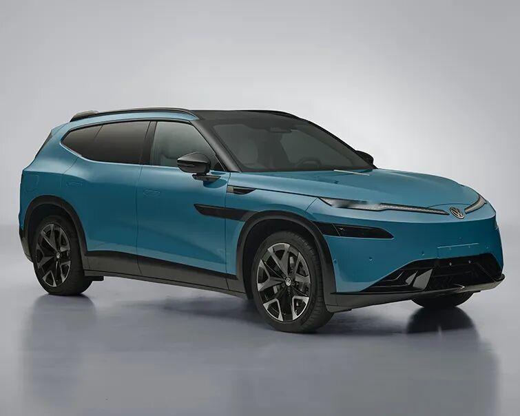 与众08正式发布官图,与众08基本延续ID. EVO概念车的设计,前脸采用封闭式造型,狭长且上扬的大灯组,配合中央大众品牌LOGO,下包围设计有黑化装饰件,整体延续了大众安徽大胆、前卫、犀利的设计风格。