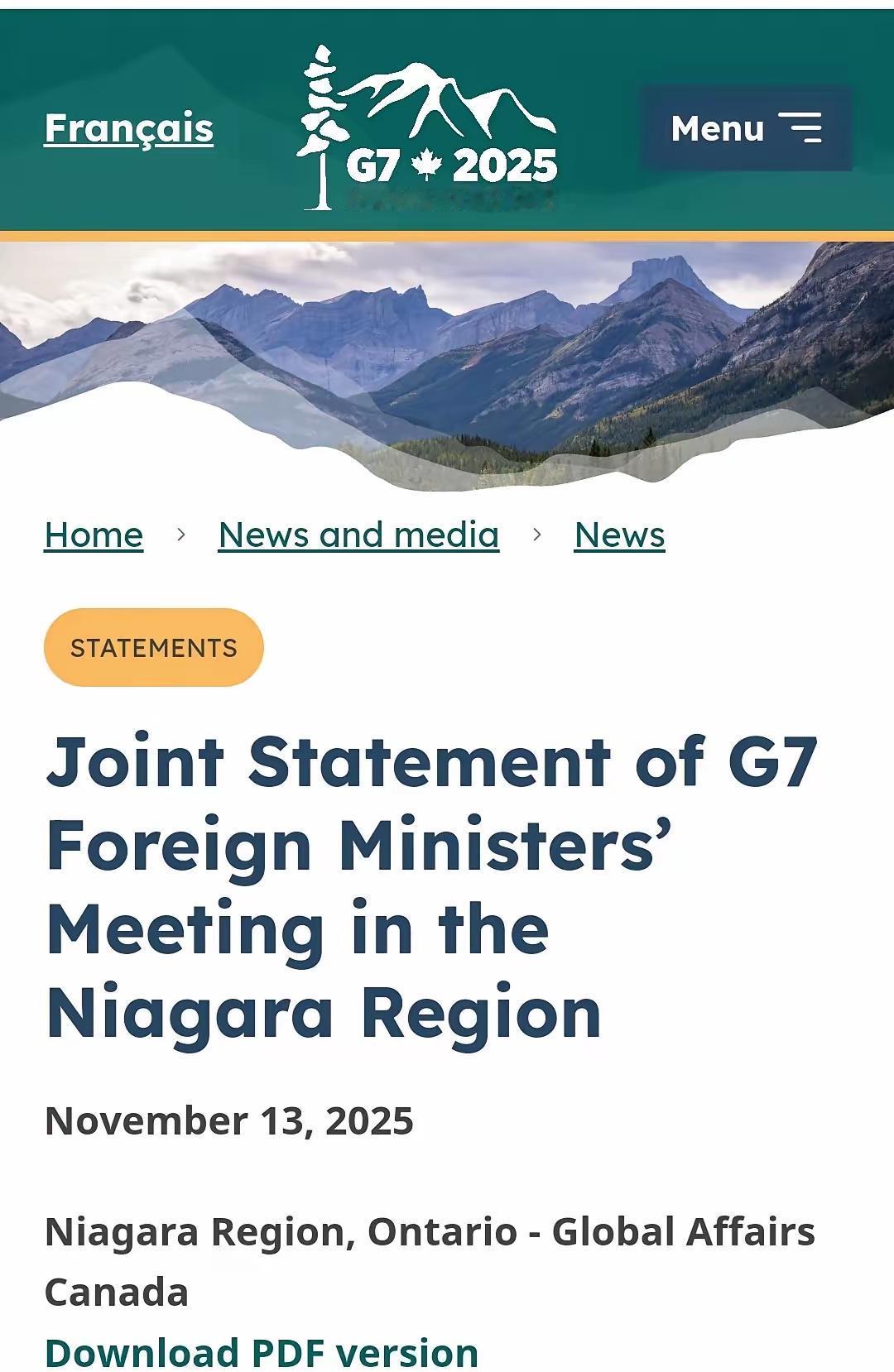 11月13日,加拿大召开的七国集团外长会议结束并发表联合声明,中国被提及三次。一是在乌克兰问题上,尖锐“谴责”中方,称中方提供武器等是俄发动战争的决定性因素,中方必须回应;二是印太问题,围绕台海,沿袭旧论述,鼓励台“国际参与”,未涉军事援台等;三是供应链问题,对中方稀土政策表忧虑,赞赏中美韩协议。声明沿袭旧调且偏负面,今天记者会或回应驳斥。马克龙邀中方参加明年峰会,若声明如此,中方恐难参会。 评论: 自不量力,中国已经是购买力世界第一,增速远超七国,世界第二大经济体,5000年文明古国,跟着学都不一定会,还在那指手画脚,撒泡尿照照。 中国不可能参加每次都发表挑衅中国声明的七国集团会议,也因为七国集团坚持的是霸权双重标准,破坏的是世界的和平稳定 放弃一切幻想。中国只要不断深入反腐除奸,不断发展国防科技,不断壮大做强中国制造业,不断团结一切可以团结的力量,不断走社会主义道路,提高人民福祉,中国就会立于不败之地。