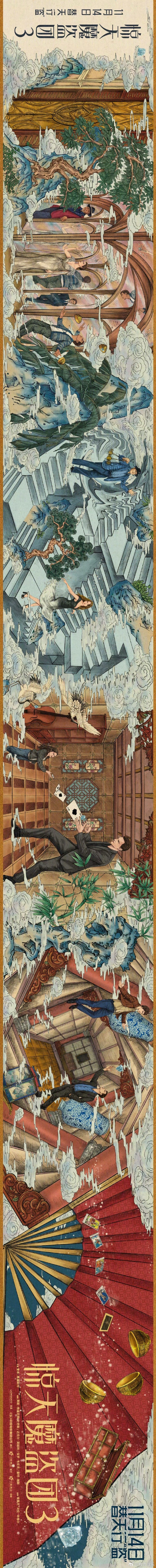 魔术犯罪电影《惊天魔盗团3》发布中国独家海报,以中国山水画卷轴的形式,将电影主要魔术场景徐徐展开,在白云仙鹤和群山峰峦间,骑士们施展魔术绝技,上下颠倒屋、镜像迷宫、三仙归洞、读心术、化蝶、飞牌术、悬浮术……电影讲述了骑士团以魔术设下惊天陷阱,和反派钻石女王展开了一场局中局骗中骗计中计的博弈,将于明日(11月14日)上映。