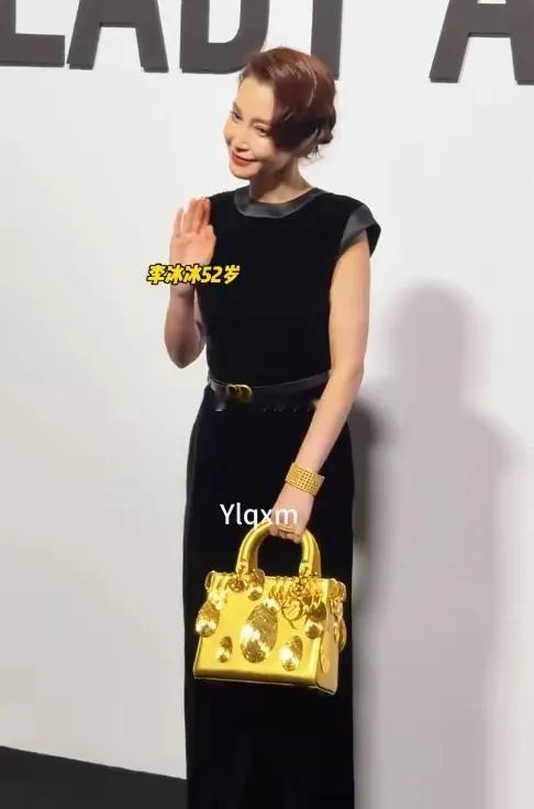 笑死了!李冰冰真大胆啊,黑色连衣裙配了土豪金的包包,这配色,映入眼帘的只有一只土豪金的包包了!