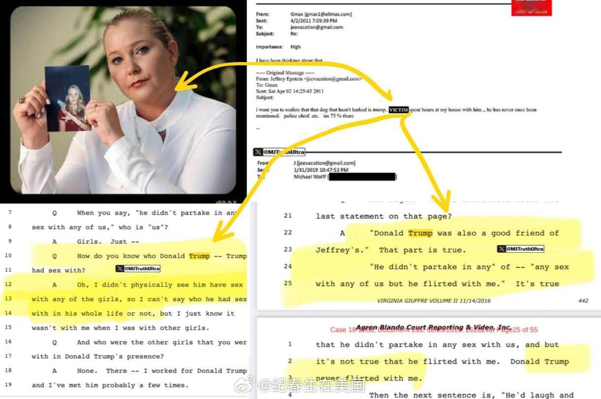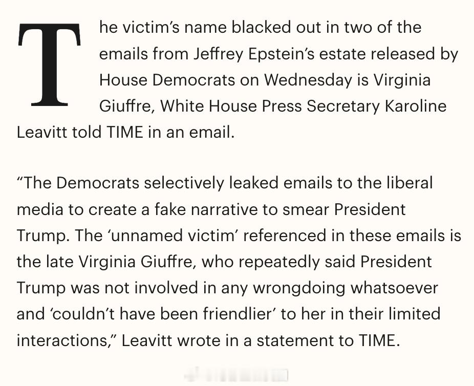 白宫方面表示,众议院监督委员会今天公布的爱泼斯坦邮件中(包括爱泼斯坦说川普和一名受害者在他家共处了几个小时),被涂黑的“受害者”人名是Virginia Giuffre。而Giuffre本人在2016年的一份宣誓证词中曾表示,川普没有和她发生任何性行为,也没和她调情。她没见过川普和任何女孩发生关系。川普从没和其他女孩待在一起过。