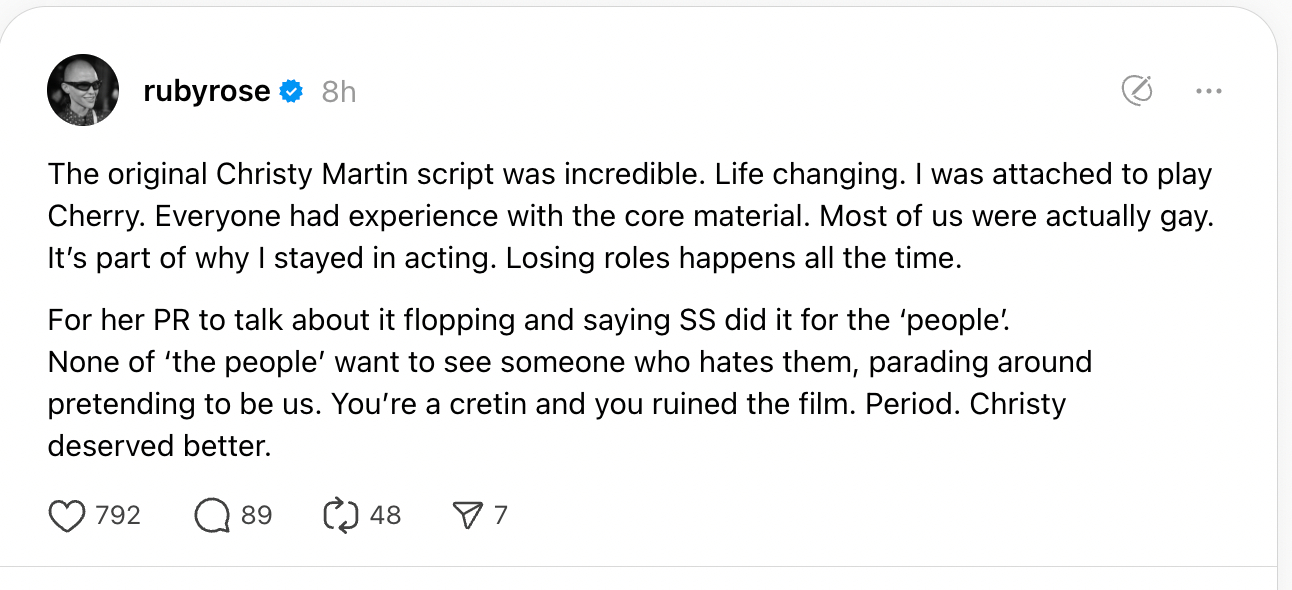 鲁比·罗丝怒喷西德尼·斯维尼。曾出演《蝙蝠女侠》与《女子监狱》的演员鲁比·罗丝在社交平台上猛喷西德妮·斯威尼,称其为“蠢货”。此事源于斯威尼主演的摔跤手克里斯蒂·马丁传记片《克里斯蒂》票房惨淡,该片北美首周仅在2000余家影院收获130万美元票房,而制作成本高达1500万美元。罗丝发文中表示:“原版《克里斯蒂》剧本非常出色,足以改变人生。我原本要饰演‘cherry一角(克里蒂斯高中前女友),团队大多成员是LGBT群体且深谙核心题材,这也是我坚持演戏的原因之一。失去角色很常见,但她的团队却标榜影片‘为人民(people)而拍’,但人民不会想看一个憎恶他们的人伪装成我们招摇过市。你就是个蠢货,彻底毁了这部电影。克里斯蒂值得更好的。”大概背景就是,克里斯蒂·马丁是LGBT群体,鲁比·罗丝也是LGBT,她觉得你西德尼·斯维尼一直是支持共和党的倾向,却跑来演LGBT电影,还说是为了人民而拍,这很离谱,还认为大家不看这部电影,就是因为你。斯威尼之前曾经说过,电影的意义在于传递影响力,强调其对提升家庭暴力意识的贡献。