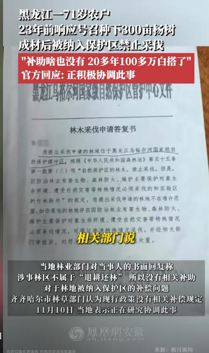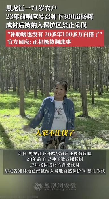 黑龙江,71岁农户23年前响应号召种下300亩杨树,成材后却被纳入保护区禁止采伐,一分补助也没有给农户!农户:“上哪里说理去!我20多年的投入,100多万白搭了!”官方回应:正积极协调此事! 事情的起因是小汪(化名)阿姨71 岁的人了,每天还得往林场跑,站在自己种的杨树下,看着枝繁叶茂的林子,她眼泪都快下来了,这片 300 亩的林子,是她攒了一辈子的家底。 23 年前,国家号召植树,小汪阿姨一听就动了心,她想着,种点树既能响应号召,将来成材了还能给儿女留点养老钱,自己晚年也有个依靠。 那时候她干劲足得很,拿出所有积蓄,又凑了些钱,前前后后花了一百多万,树苗是她一棵一棵选的,肥料是她一车一车拉的,每年修枝剪叶更是亲力亲为,哪棵树长得慢,哪片地需要多施肥,她都记得清清楚楚。 村里人都说她傻,把钱砸在地里,不知道要等多少年才能见回头钱,可小汪阿姨不觉得,她看着小树苗一天天长高,心里满是盼头。 就这么盼了 23 年,树终于成材了,眼瞅着就能砍了卖钱,收回这些年的投入,小汪阿姨夜里都能笑醒。 可谁能想到,一纸政策下来,她的希望全落空了,这片地被划进了保护区,禁止采伐,原本能卖钱的树,现在一棵都动不了。 她去找相关部门问,想要个说法,得到的回复是正在积极协调,会调研对接,找合法合规的办法。可这话听着暖心,落地却没个准信。 小汪阿姨拿着账本,翻来覆去地算,这些年的投入,一笔一笔都记在上面,可现在连本都收不回来,她坐在林场边上,忍不住跟人念叨,“ 20 多年的投入,100 多万白搭了,上哪里说理去? 声音里满是愤怒,更多的是无力,她年纪大了,身体不如从前,本指望这些树能让晚年过得舒坦点,现在却成了泡影。 其实这事,不是说谁对谁错,当初植树是国家鼓励的,小汪阿姨也是真心实意想做点事,还承担了这么大的成本,现在要保护生态,这没错,可也不能让老百姓的心血白白浪费啊。 大家都希望,相关部门能快点行动起来,先派人去查查,看看小汪阿姨这情况到底该咋补偿,再把林权、林木的所有权弄清楚,给她一个明确的说法,眼下她生活有困难,能不能先给点救助,帮她渡过难关。 小汪阿姨现在还在等消息,那些树就像她的孩子一样,她就想在自己还能看得见的时候,把这事解决了,别让一辈子的盼头,最后成了遗憾。 对此,你还有什么看法呢? (信息来源 :凤凰网安徽 )