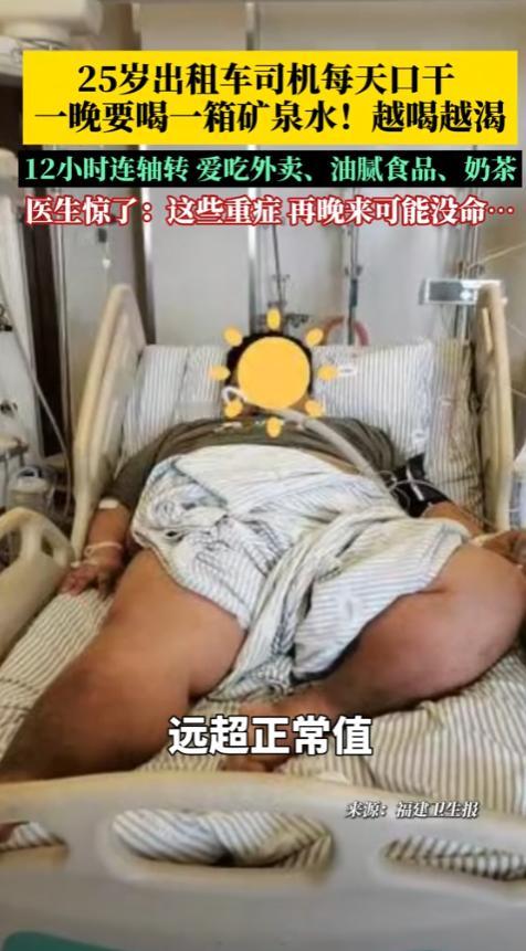 后怕!福建,一位25岁出租车司机经常觉得口渴,开始他还没在意,可后面这种感觉越来越强烈,甚至一晚上要喝一箱矿泉水,持续一个月后身体到底出现了问题,送医后确诊多系统危重症。医生:再晚来可能没命! 据第一眼新闻11月12日报道,这小哥姓杨,身高一米六八,体重却足足有两百斤,往那一站,就是个敦实的小胖子。 他跟很多跑出租的师傅一样,为了多挣点钱养家,一天有十二个小时屁股都黏在驾驶座上,吃饭这事儿,对他来说就是个任务,手机上点个外卖,什么油大、味咸就来什么,吃得那叫一个香。 除了吃饭,他还有个伴儿,就是奶茶和各种甜饮料,一天不喝上几杯就浑身难受,觉得这才是年轻人的标配。 就这样日复一日,他觉得自己年轻,身体壮得像头牛,熬夜跑车、胡吃海喝都不是事儿,身体这东西,你年轻的时候怎么糟蹋它,它都默不作声,可一旦它开始反击,那可就不是闹着玩的了。 大概在一个多月前,小杨师傅开始觉得不对劲,最开始的信号,就是口渴,起初,他没当回事,渴了就喝水呗,车上常备着水。 可慢慢地,这渴的感觉越来越控制不住,从一天几杯水,发展到一天几瓶水,到后来,情况变得有点吓人,他一个晚上,就得干掉一整箱矿泉水,差不多有二十多瓶。 就算是这样抱着水桶喝,嘴里还是干得像撒哈拉沙漠,甚至发苦,那种感觉就是越喝越渴,永远也解不了渴。 这一个月里,他不仅是口渴,人也变得没啥精神,整天昏昏沉沉的,体重还莫名其妙地往下掉,可他还是仗着年轻,硬扛着,觉得可能是最近太累了,休息休息就好了。 直到有一天,他实在扛不住了,整个人都快虚脱了,被家人急急忙忙地送进了医院,到了医院一检查,医生一看结果都吓了一跳。 小杨师傅的血糖值已经高到仪器都快测不出来了,是正常人的十几倍。诊断书上那一串名词,哪个都够吓人的:糖尿病酮症酸中毒、重症急性胰腺炎、急性肾功能不全、重度脂肪肝…… 这已经不是单一的毛病了,而是整个身体的代谢系统全面崩溃,医学上管这叫“多系统危重症”,医生直接跟家属说,再晚来一步,人可能就没了,这下子,小杨师傅和家人才彻底慌了神。 一个25岁的年轻人,怎么就突然得了这么一堆老年人才会得的要命的病?医生解释得很直白,这病根本不是突然来的,就是他自己一口一口吃出来,一杯一杯喝出来的。 每天高油高盐高糖的外卖,再加上从不离手的奶茶甜饮料,身体里的胰腺和肾脏这些器官长期超负荷工作,早就被折腾得奄奄一息了。 他那两百斤的体重,就是身体发出的最明显的警告信号,可惜他一直没当回事,这事儿在网上传开后,好多网友都说自己身边就有这样的人,甚至自己就是这样。 有个网友说:“我老公也是开车的,一天到晚坐着,也是爱喝饮料,看了这个我得赶紧拉他去体检。” 还有人说:“别说司机了,我们这些坐办公室的也好不到哪去,奶茶就是续命水,看来这命是拿健康换的。”这些评论看的人心里五味杂陈,好像说的就是我们自己或者身边的人。 其实,小杨师傅的经历就像一面镜子,照出了现在很多年轻人的生活状态,我们总觉得疾病和死亡离自己很遥远,总以为年轻就是最大的资本,可以随意挥霍。 加班熬夜成了家常便饭,炸鸡奶茶被当成生活调剂,久坐不动更是很多人的常态,我们用这些短暂的快乐和所谓的“拼搏”,一点点地透支着自己的健康。 身体是最诚实的,你对它好,它就给你一个好的状态,你对它不好,它迟早会把所有的账都给你算清楚。 别等到身体拉响警报,进了医院才后悔莫及,那个时候,你失去的可能不只是金钱,更是陪伴家人的时间和未来的无限可能。 这件事也给我们提了个醒,别总拿“我还年轻”当借口,健康这东西,从来不看你的身份证,尤其是像出租车司机、外卖员、程序员这些需要长时间久坐的职业人群,更得时刻关注自己的身体变化。 别觉得体检是浪费钱,也别觉得规律作息、健康饮食是老年人的养生方式,这才是对自己、对家人最基本的负责。 希望小杨师傅这次能挺过来,也希望我们每个人都能从他的故事里得到警醒。 信源:第1眼新闻2025-11-12——25岁小伙生病一晚喝一箱矿泉水 ,而且越喝越渴。送医后被确诊为糖尿病酮症酸中毒、急性胰腺炎、肾功能不全、高脂血症等多系统危重症。医生:再晚来可能没命