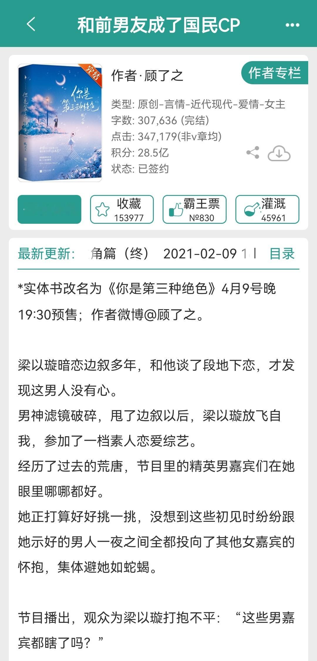 《和前男友成了国民CP》by顾了之 娱乐圈文,两个菜鸡的初恋故事 开篇真的会被男主气死,怎么会有这么自大,不长嘴,不尊重人的男主女主也是自怨自艾,小可怜即视感。 但没几章就分手了,爽🆒 后面洗白了一下,男主以为女主只把自己当恋爱工具,人形an mo棒,才故作冷酷发现真相后直接一个托马斯大旋转,锯嘴葫芦成对外冷酷,对内体贴全面眼里心里只有你的二十四孝好男友。 有点生硬,但爱吃破镜重圆,误会重重,追妻火葬场(没很多)的还是很喜欢的 副CP也很好玩,去恋综找灵感的编剧✖️玩赛车被停卡,为钱都ok的富二代,年下还会叫姐姐哦