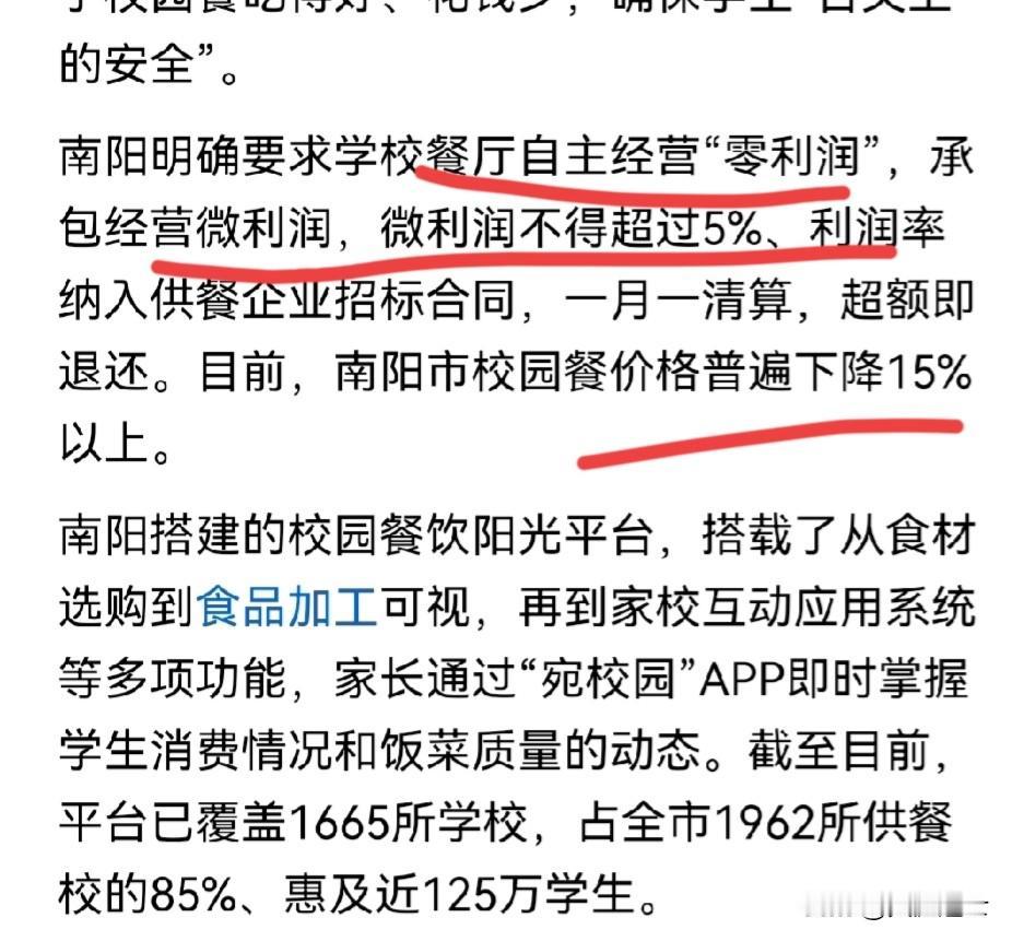 我就是南阳的,新闻说第五完全学校初中部的学校食堂饭菜质量提高了,价格也更实惠了,还说饭菜比在家里做的都好。我还真不知道这情况,有没有南阳的老乡说一说这事,啥时候开始的呢,我外甥虽然不是五完的,但也是南阳某中学学生啊。 不过这个校园餐饮阳光平台我听说过,各个城市都在搞这个,我们南阳的要求很高的,自主经营净利润,承包经营微利润且不得超过5%,我都不知道餐厅承包商怎么挣钱?当然了,完整的食品供应链都应该纳入统计,不能只看餐厅内部。