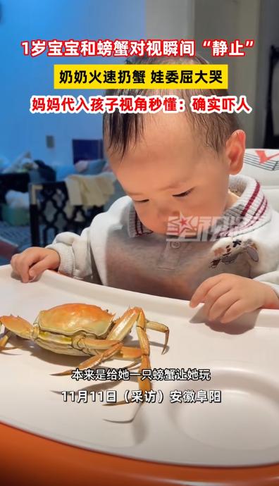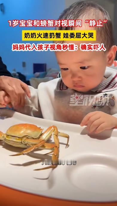 太可怕了!安徽一女子把煮熟螃蟹给宝宝玩,没想到宝宝一直盯着螃蟹看,半天都没有动过