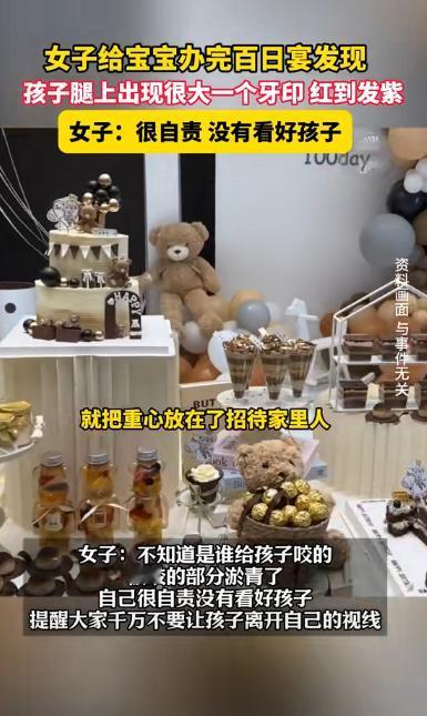 甘肃,一位妈妈给宝宝办百日宴,可晚上宴席结束后,她却发现宝宝的腿上竟然多出来一道牙印,而且红到发紫,显然这是被人给咬了,这位妈妈当场就哭了,心里又气又自责,怪自己没看好孩子 事情的起因是那天张女士(化名)家宝宝的百日宴,她特意请了双方亲戚朋友来聚餐,好久没见父母,她想让娘家人好好热闹热闹,享享天伦之乐,宴席上满是笑声,大家都围着宝宝转。 宝宝由奶奶照看着,张女士一会儿招呼客人吃菜,一会儿举着手机拍照,想把孩子这个重要的日子都记录下来,亲戚朋友轮流抱宝宝合影,逗得宝宝咯咯笑,场面看着特别温馨。 可谁能想到,宴席结束后换尿布时,意外来了,张女士给宝宝清理的时候,突然看见宝宝腿上有一道明显的牙印,皮肤又红又肿,还有点发紫,用手摸上去,温度比其他地方稍高。 她一下子就愣住了,眼泪控制不住地往下掉,心里又气又怪自己,宴会上那么多人,孩子怎么会被咬伤,是不是自己光顾着招呼亲人,没看好宝宝。 婆婆听到动静凑过来,看见牙印也吓了一跳,她回忆说,当时宴会上人来人往,好多亲戚都抱过孩子、逗过孩子,现场太热闹了,根本没法确定是谁不小心咬到的。 原本喜庆的气氛一下子没了,大家都沉着脸,张女士更是后悔,心想早知道就自己亲自看着宝宝,再忙也不能把孩子的安全当小事。 这事儿传到网上后,网友们也议论纷纷,有人说看着孩子受伤就心疼,指责家长在人多的时候就该盯紧点,宝宝那么小,皮肤嫩得很,哪经得起这样的伤害。 此外也有人提醒,不管是亲戚还是朋友,人多手杂,抱孩子的时候都可能有疏忽,不能掉以轻心,还有人劝张女士,别光顾着自责,先看看宝宝的伤口要不要紧,实在不放心就去医院检查,别让伤口感染了。 那么通过这件事情也给所有家长提了个醒,不管是在家还是在外边办活动,宝宝的安全永远是第一位的,人多热闹的时候,更得安排专门的人看着孩子,别让意外有机会发生。 后来经过这事儿,张女士也说,以后就算是再亲近的人在身边,也不会忽视宝宝的防护。 虽然百日宴的完美气氛被破坏了,但也让更多家庭明白,幸福和安全得一起守护,热闹的聚会、亲人的互动很珍贵,可比起这些,宝宝平平安安才最重要。 对此,你还有什么看法呢? (信息来源 :南昌晚报 )