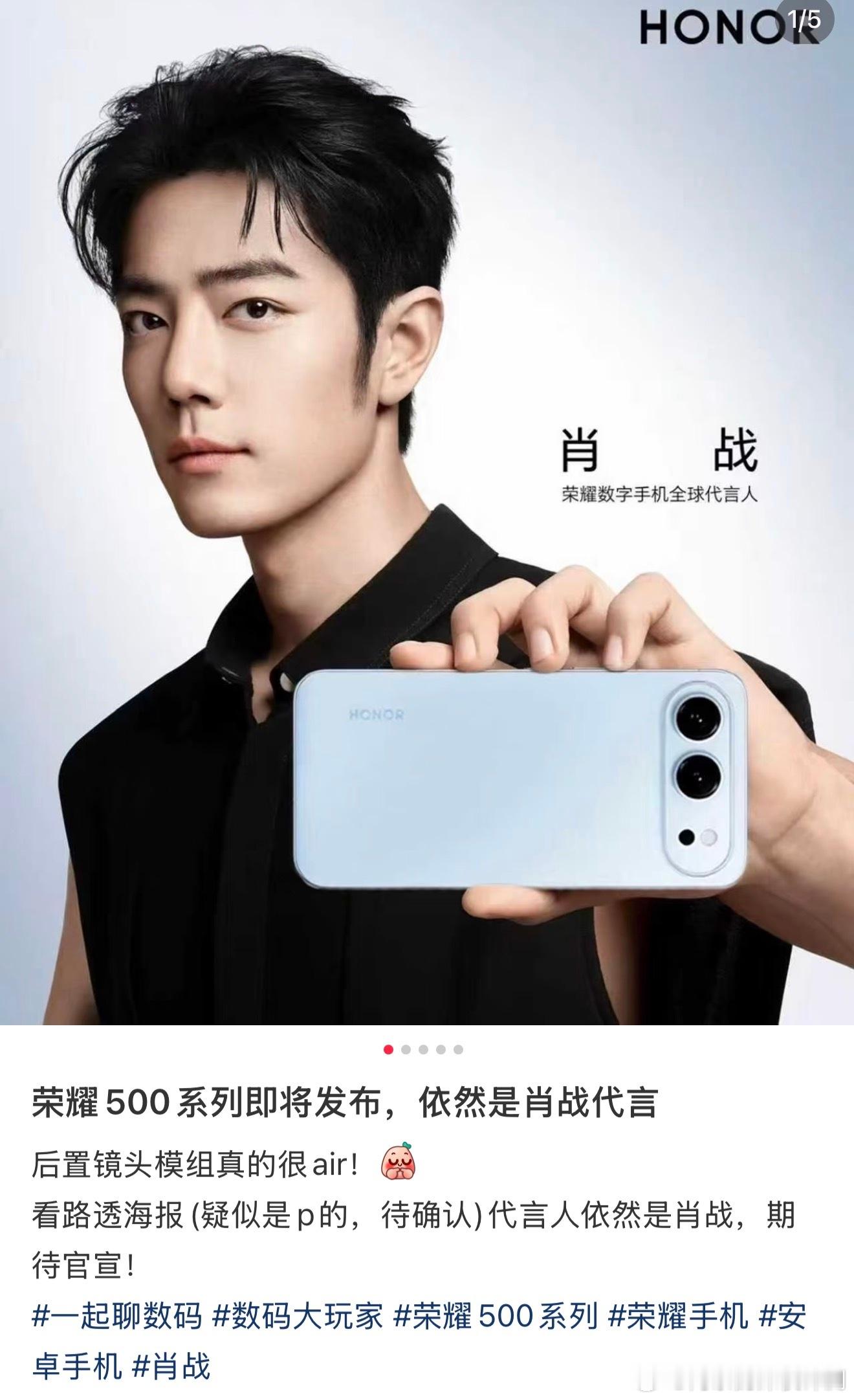 荣耀500马上就要发布了,真机在小🍠被各种曝光,代言人应该还是肖战,不得不承认,肖战代言,荣耀400销量真的是起飞了,全球发货量突破600万,新款500的节奏也挺好,提前就开始多方预热,粉丝热情也很高涨。聊个老生常谈的问题,买手机会在乎代言人嘛??我不在乎,但是不影响有大把的粉丝在乎,品牌方都是会做品销调研的,虽然很多人对流量明星不感冒,甚至有些反感,但是粉丝多,粉丝买账,的确会对销量有明显提升,当然这几年签流量明星也有风险,就怕塌房,所以也开始签有流量的体育明星,怎么说呢,品牌方签代言,机器卖的更好,代言人赚到代言费,粉丝买到偶像代言的手机(支持),多方共赢,也没啥不好
