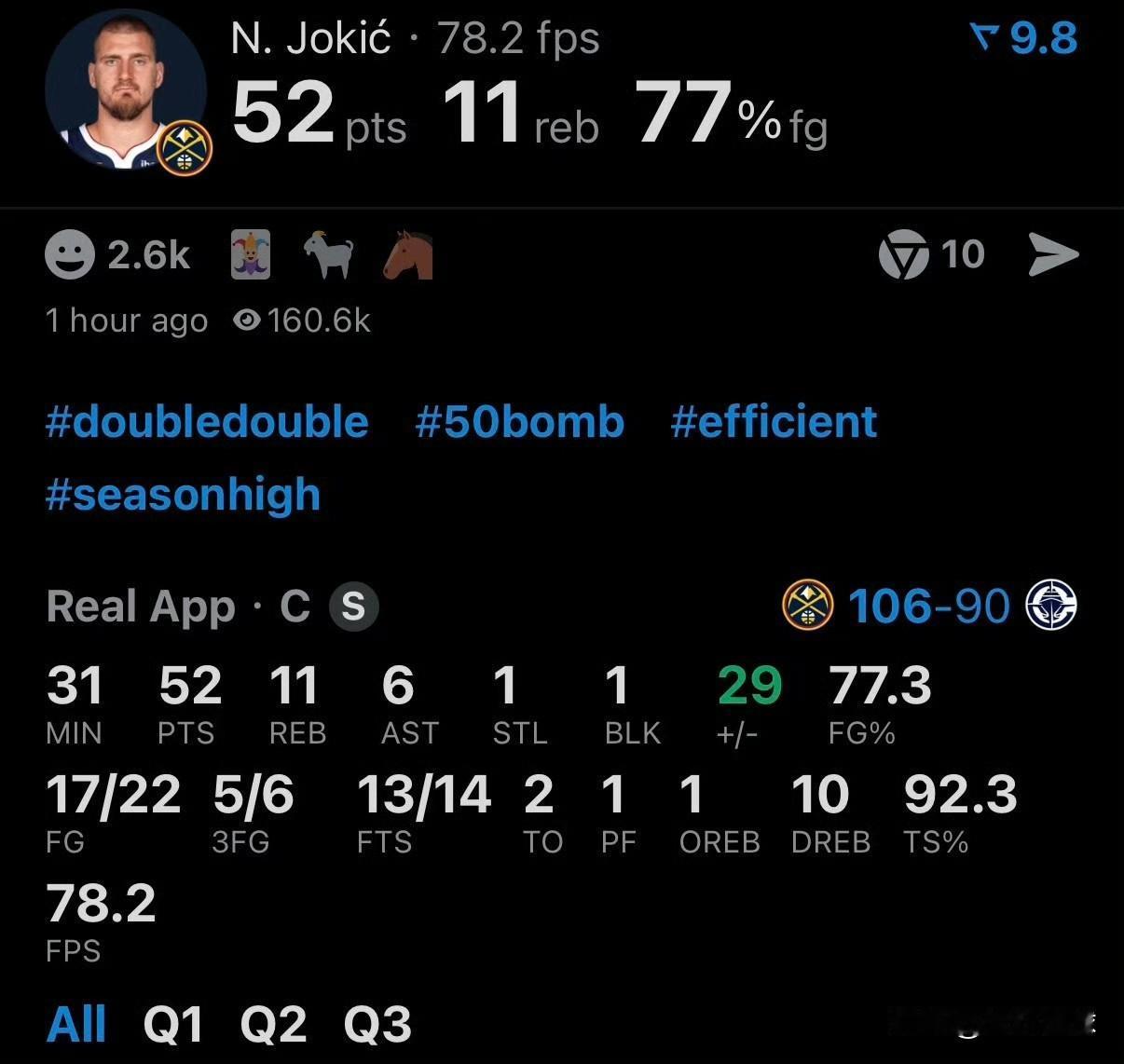 要上60分!大哥你是背靠背啊! 今天,掘金队客场背靠背挑战快船队,约基奇继续火力全开,上半场贡献了单节25分的神奇表演,三节结束已经狂轰52分11篮板6助攻,投篮22中17,其中三分球6中5,罚球14中13,效率高得惊人。帮助球队三节取得了16分的领先优势。 本场比赛,约基奇极有可能砍下60+的得分,背靠背作战还能砍如此高分,现役第一人当之无愧!