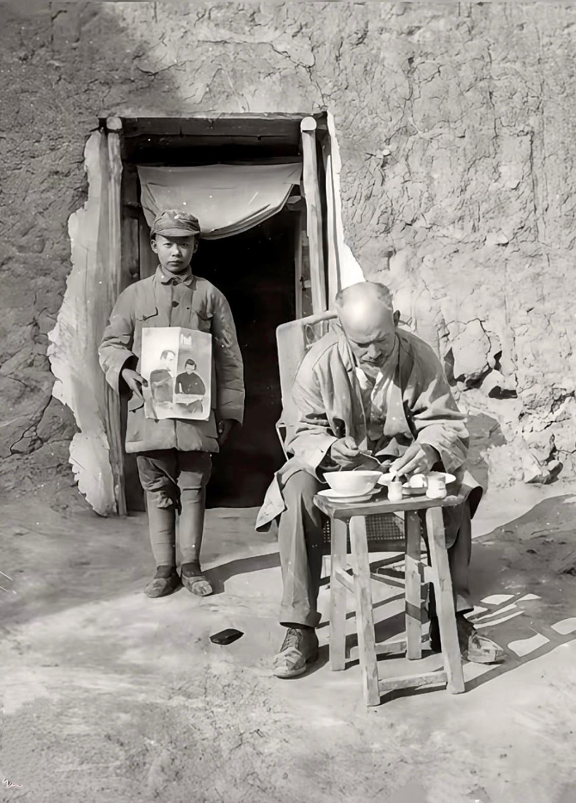 这张由著名战地记者沙飞拍摄的照片里,加拿大医生白求恩正坐在土坯房前吃着简单的“特