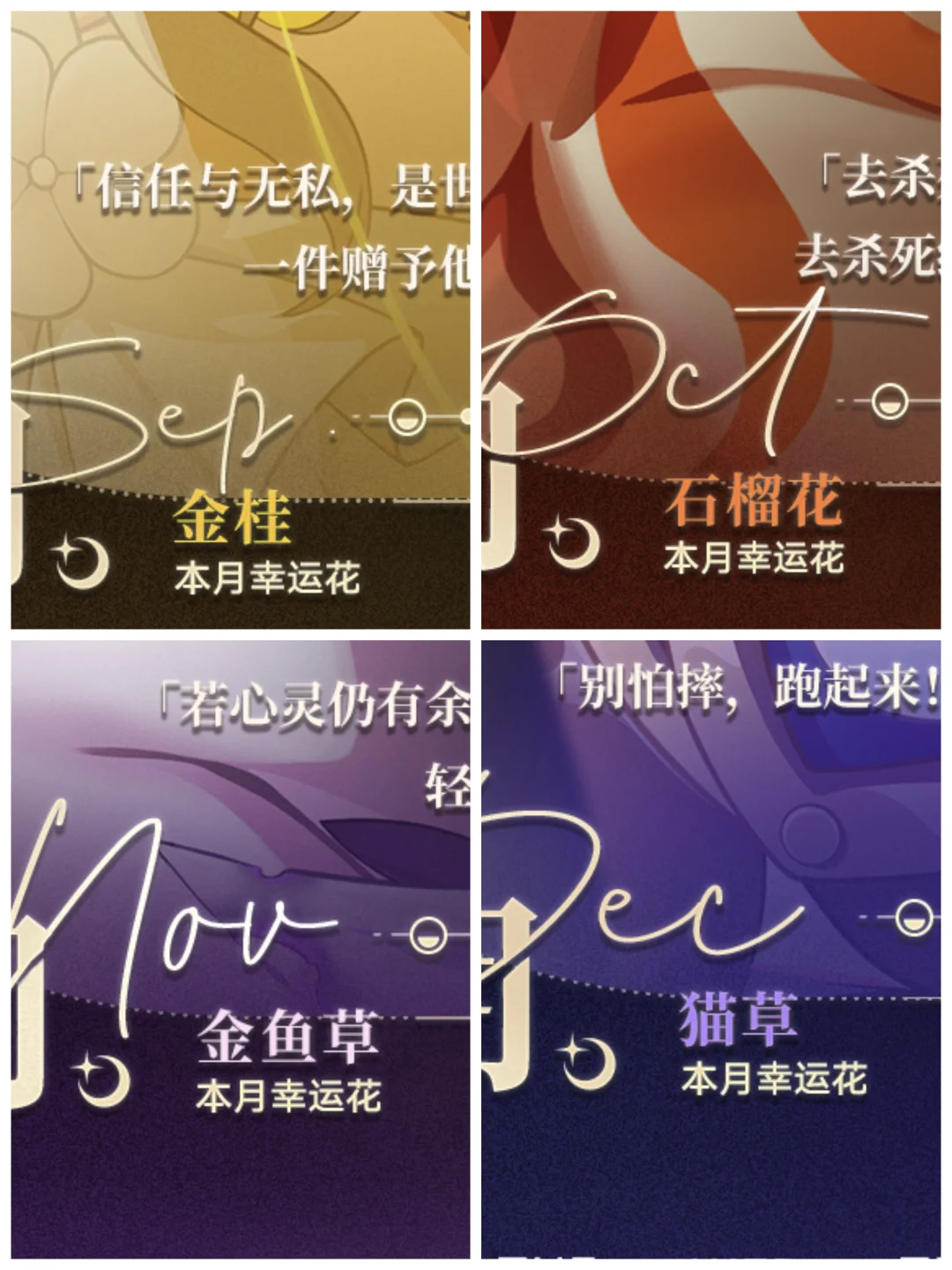 看到翁法罗斯一年历里,各黄金裔们代表的月份里的幸运花,感觉好贴合他们呀[萌萌哒R] 🌸缇宝——铃兰 🌸刻律德菈——帝王花 🌸长夜月——四叶草 🌸腾荒——兰花 🌸海瑟音——睡莲 🌸风堇——向日葵 🌸白厄——勿忘我 🌸那刻夏——无尽夏 🌸阿格莱雅——金桂 🌸万敌——石榴花 🌸遐蝶——金鱼草 🌸赛飞儿——猫草
