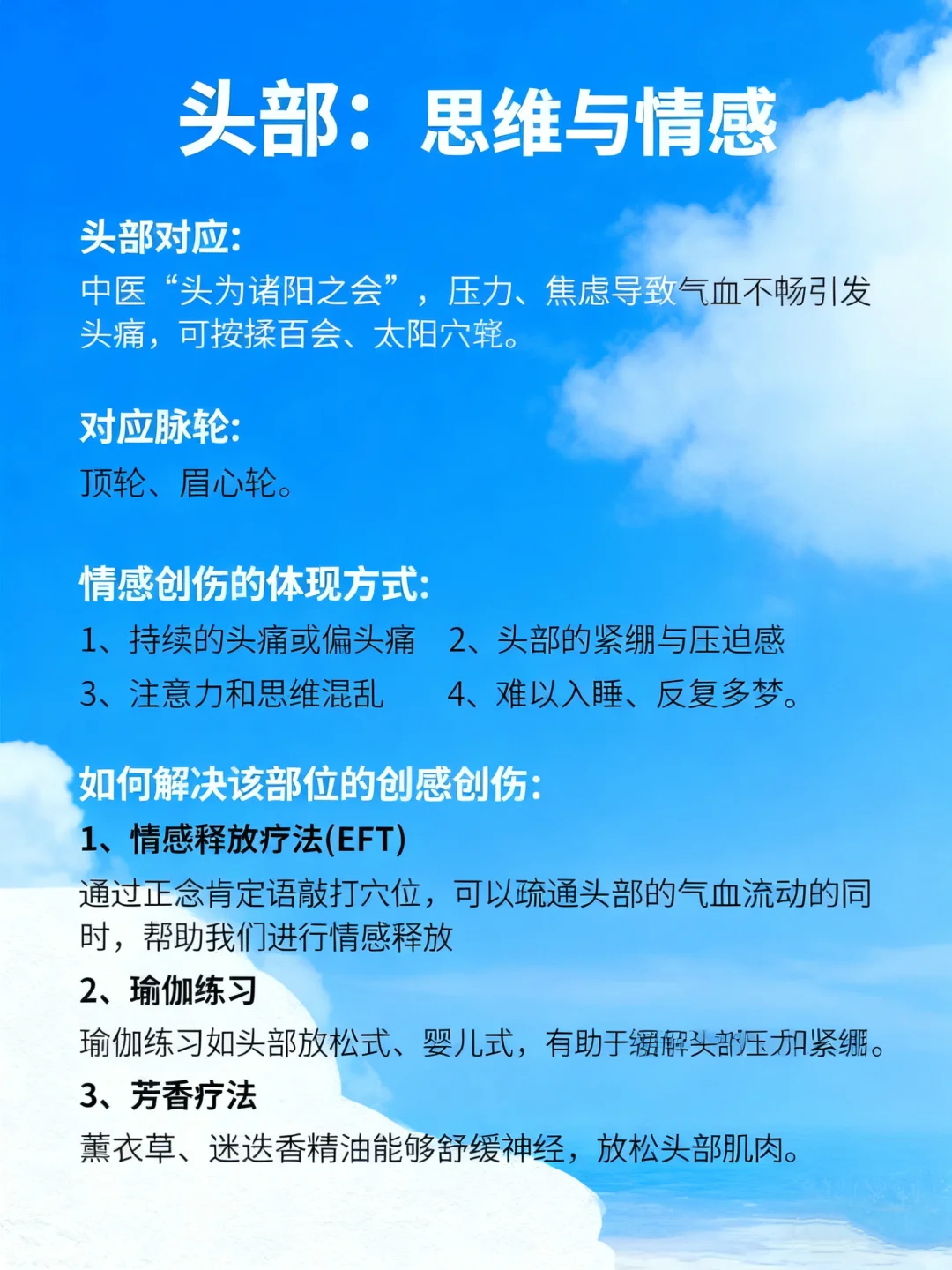 身体本就是情绪的一面镜子,肝气郁结可能引发肩颈胀痛、头痛胁痛,思虑过度容易导致脾胃虚弱、周身乏力,焦虑难安常会诱发失眠多梦、肢体酸痛 —— 每一处不舒服,都是内心气血失调的轻声呼唤。