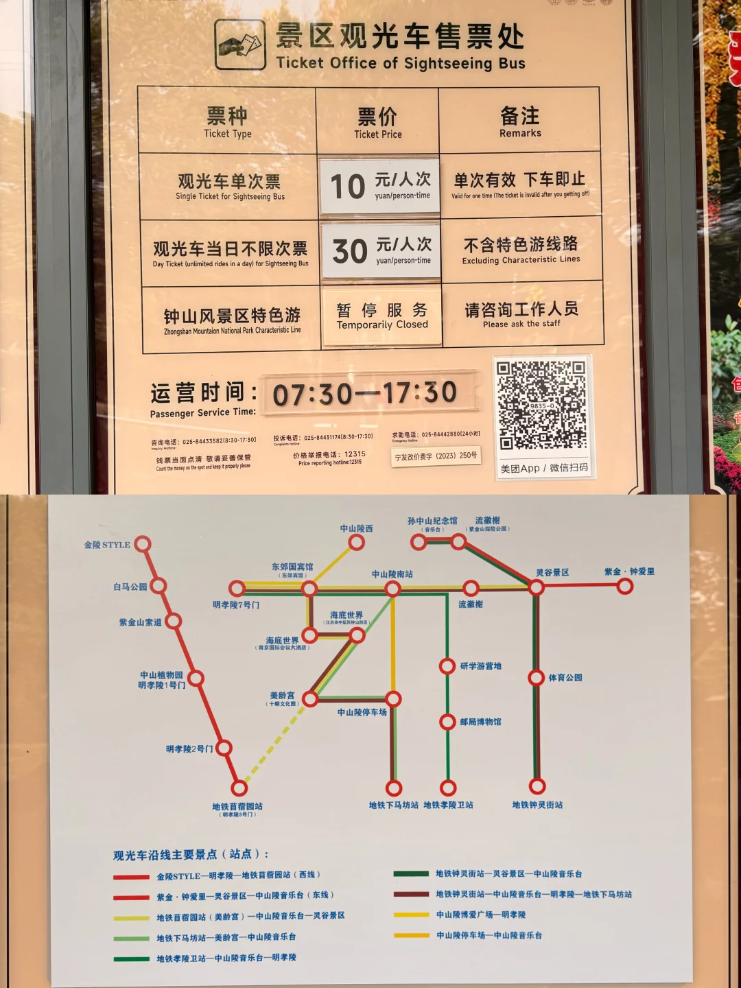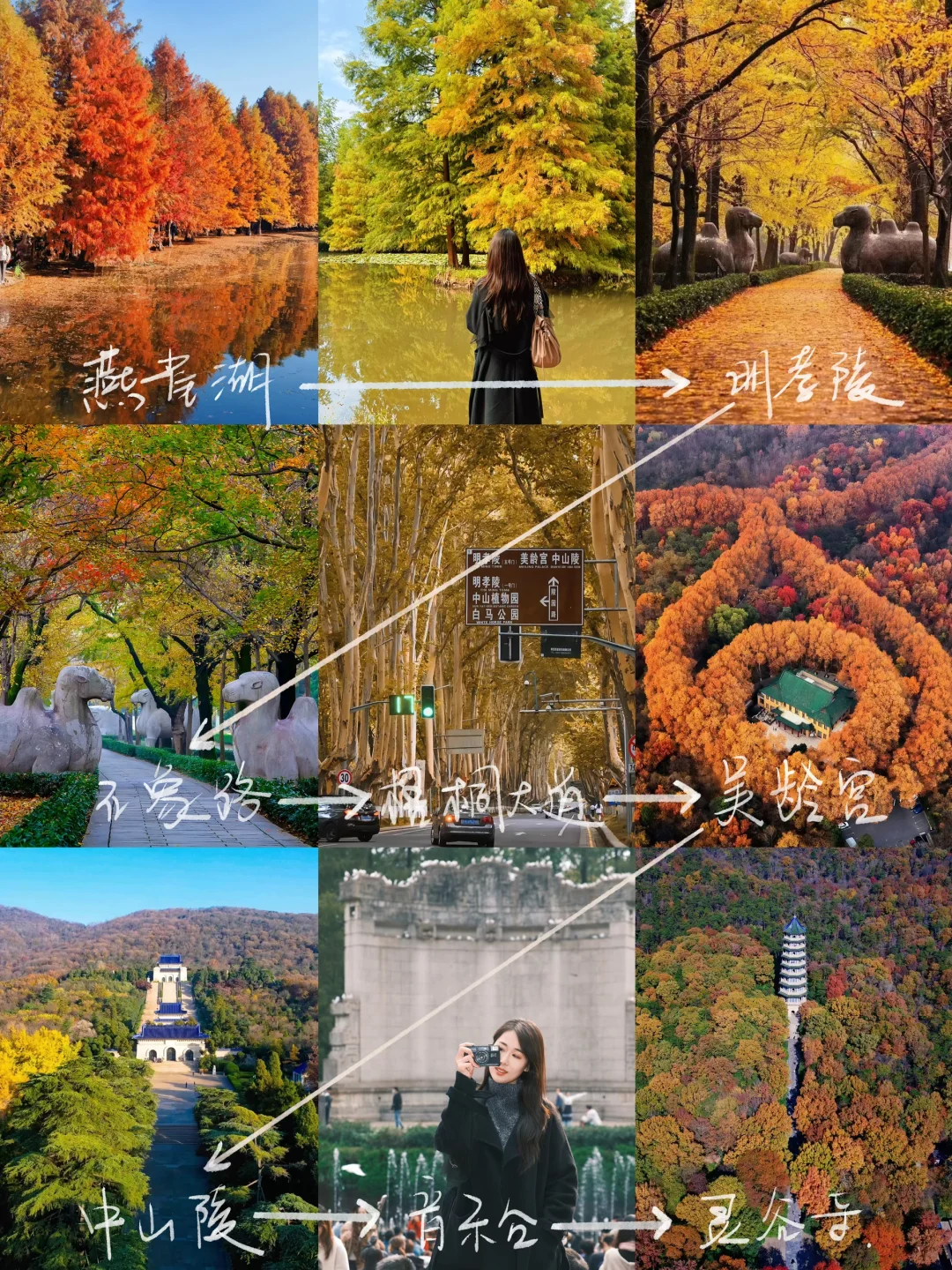 走在铺满梧桐叶的路上 感受独属于金陵的浪漫与诗意🍁 🚇交通:地铁2号线“苜蓿园站”1号口出(步行到明孝陵3号门)手绘地图和盖章的就在这附近[萌萌哒R] 🎫门票:联票100元(含明孝陵、美龄宫、音乐台、灵谷寺);单独购票:明孝陵70元、美龄宫30元、音乐台10元、灵谷寺35元 👉中山陵免费,提前1周在“南京钟山风景区”预约 👉明孝陵早上6:30前进入免费⭐⭐⭐⭐⭐ ⏰开放时间: - 明孝陵:6:30-18:30(18:30停止入场) - 美龄宫:7:30-18:00(17:30停止入园) - 中山陵:8:30-17:00(周一闭馆) - 音乐台:6:30-18:30(12-1月7:00-17:30) - 灵谷寺:6:30-18:00 ✅经典路线推荐🌟一日游(紧凑版) 1️⃣ 7:30 苜蓿园站→明孝陵3号门 步行5分钟,打卡红墙砖瓦+燕雀湖(秋天超美) 2️⃣ 8:30 明孝陵→石象路神道 步行8分钟,石像路是南京秋日顶流,古象+梧桐超出片 3️⃣ 10:00 石象路→美龄宫 步行12分钟,穿民国风服饰更出片,感受“远东第一别墅” 4️⃣ 11:30 美龄宫→梧桐大道→中山陵 观光车10分钟,爬392级台阶俯瞰钟山,记得穿运动鞋 5️⃣ 13:30 中山陵→音乐台 步行12分钟,有鸽群环绕飞行,鸽食1元1袋 6️⃣ 15:00 音乐台→灵谷寺 观光车8分钟,登灵谷塔赏全景,无梁殿很震撼 🍁避坑&Tips 1. 交通:景区内建议骑共享单车或坐观光车(10元/次),步行会很累 2. 预约:中山陵需提前1周在“南京钟山风景区”公众号约,周一闭馆别跑空 3. 穿搭:美龄宫穿旗袍/民国风,明孝陵穿汉服更出片 4. 鞋子:无论什么穿搭,准备双好走路的鞋子! 5. 美食:景区内吃的少,建议自带干粮,晚上可去新街口逛吃!