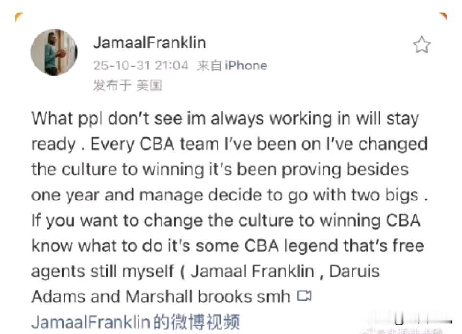 马尚有可能再返CBA!贾巴尔.富兰克林隔空喊话CBA是成因!CBA新赛季马上就要开打了,曾经在CBA联盟大杀四方的三双王、山西汾酒男篮前外援富兰克林坐不住了。上赛季,在广州龙狮任职的前山西汾酒男篮主教练杨学增的运作下,富兰克林加盟广州龙狮男篮打过一段时间比赛。本赛季他还想谋的一份工作养家糊口,如今闲赋在家心急如焚。所以,他在上月31日上书“陈情表”,隔空向CBA喊话:我和达柳斯.亚当斯、马尚.布鲁克斯都闲着呢,快来签我们吧!要说球迷为啥喜欢富兰克林呢?这哥们在为自己寻找工作的同时,顺便给马尚和亚当斯做了经纪人,极力游说将他们推荐给CBA球队。富兰克林这哥们够义气。 据昨天欧洲篮球记者EmilianoCarchia报道:经纪人Darien Logan透露,马尚.布鲁克斯正在和福建男篮商讨加盟事宜。马尚2018-19赛季加入CBA为广东男篮效力了5个赛季,总计出战171场,场均贡献22.7分5.8个篮板和4.8次助攻。在广东队总计拿下了3888分994个篮板和826次助攻;2020-2021赛季和2022-2023赛季入选国际球员最佳阵容、2020-2021赛季获得常规赛最佳国际球员奖项、3次获得月最佳国际球员奖、5次获得周最佳国际球员奖。马尚是广东男篮三连冠的最大功臣。期待福建男篮官宣!
