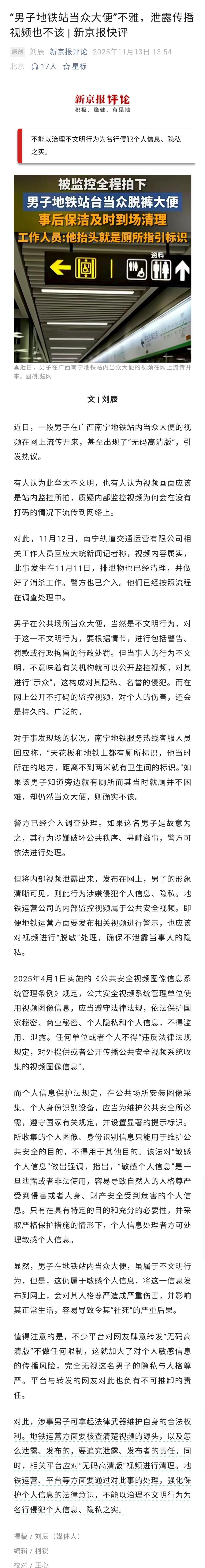 一码归一码。男子在公共场合“当众大便”,当然是不文明行为,要依法追究男子的责任(可以视情节给予警告、罚款或行政拘留等处罚)。但不能因为其行为不雅,就发布未打码、进行“脱敏”处理的“无码清晰版”监控视频,这是对其隐私、人格尊严的侵犯,是对其进行“示众”,会对其今后的正常生活产生严重影响。要依法追究泄露、发布监控视频者的法律责任。