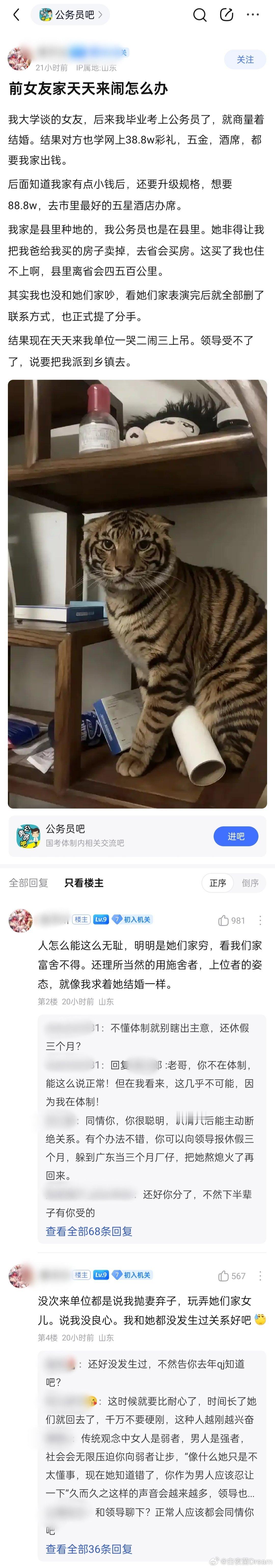 “前女友家天天来单位闹怎么办?领导受不了,说要把我派到乡镇去。”