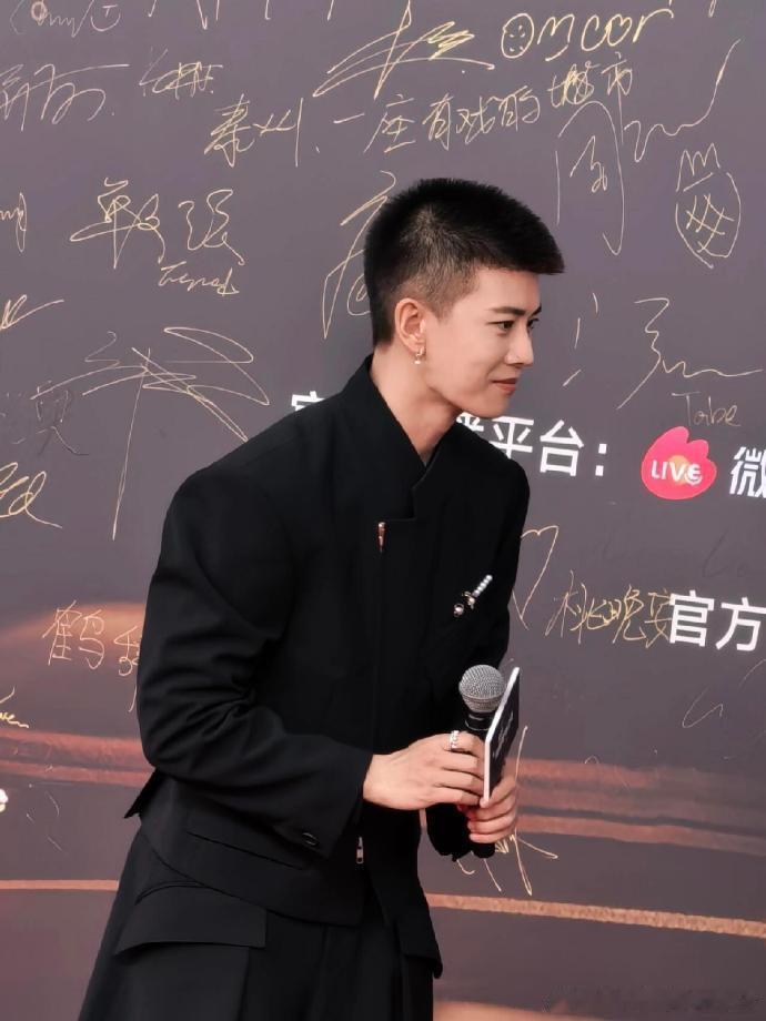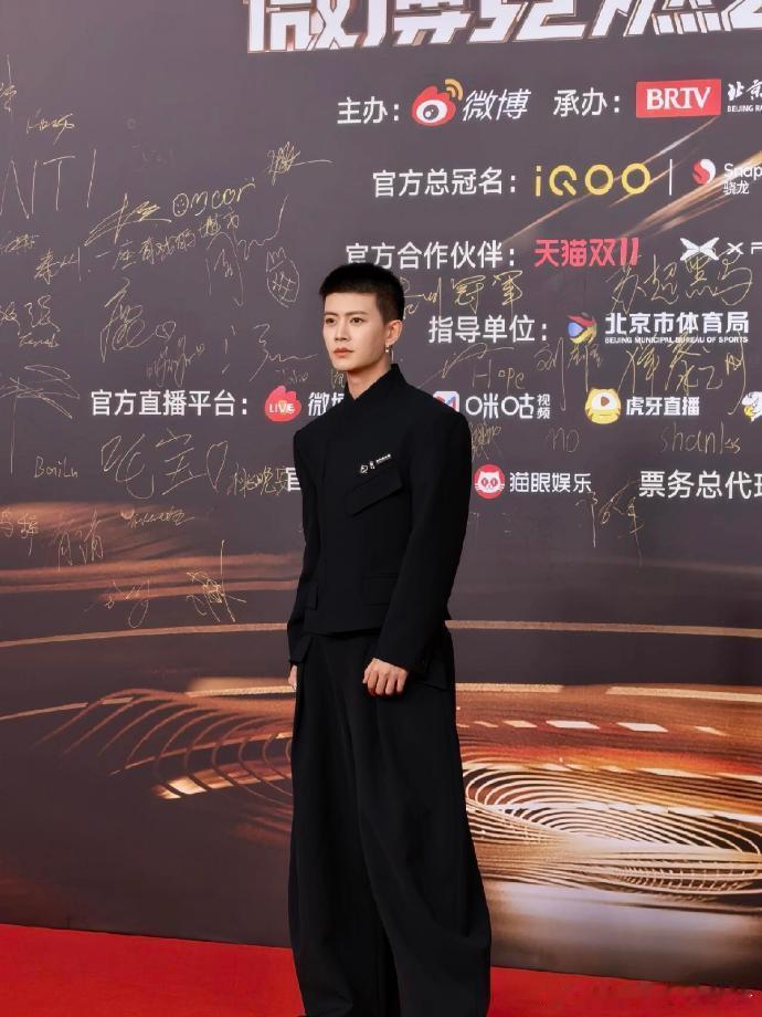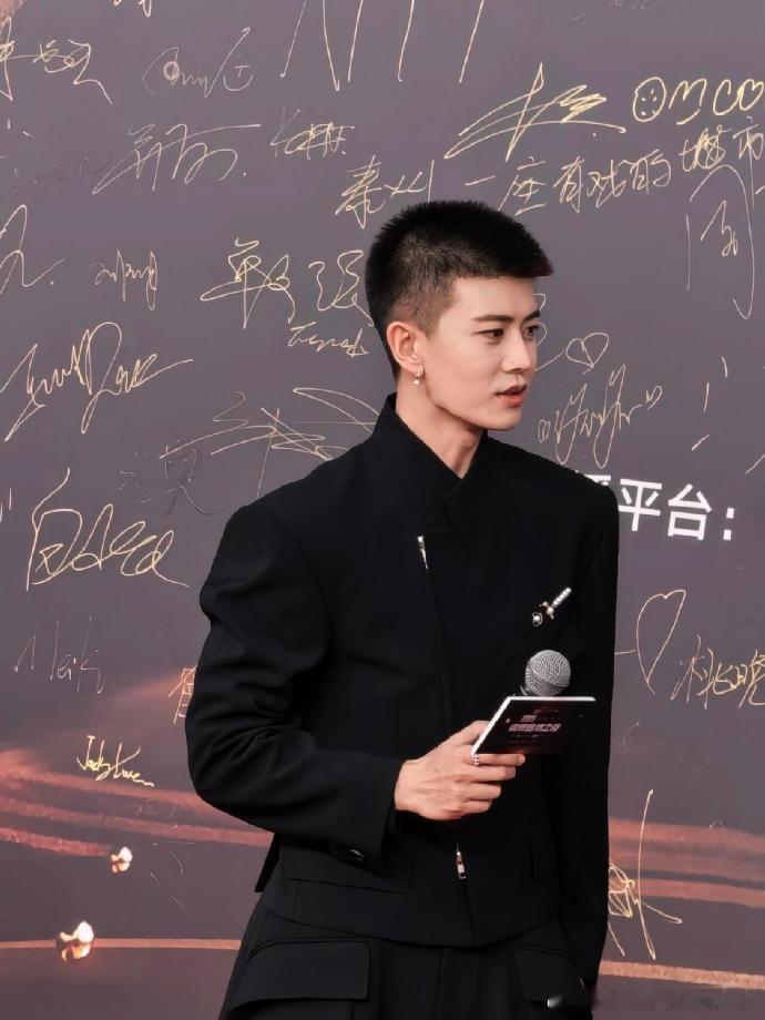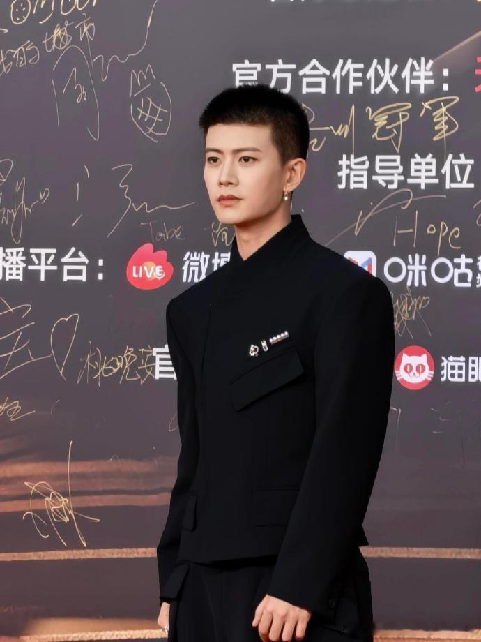 任嘉伦寸头配全黑西装亮相竞燃之夜,珍珠耳环增添质感,面部轮廓英气十足,被粉丝夸 “板正寸头帅小伙”。