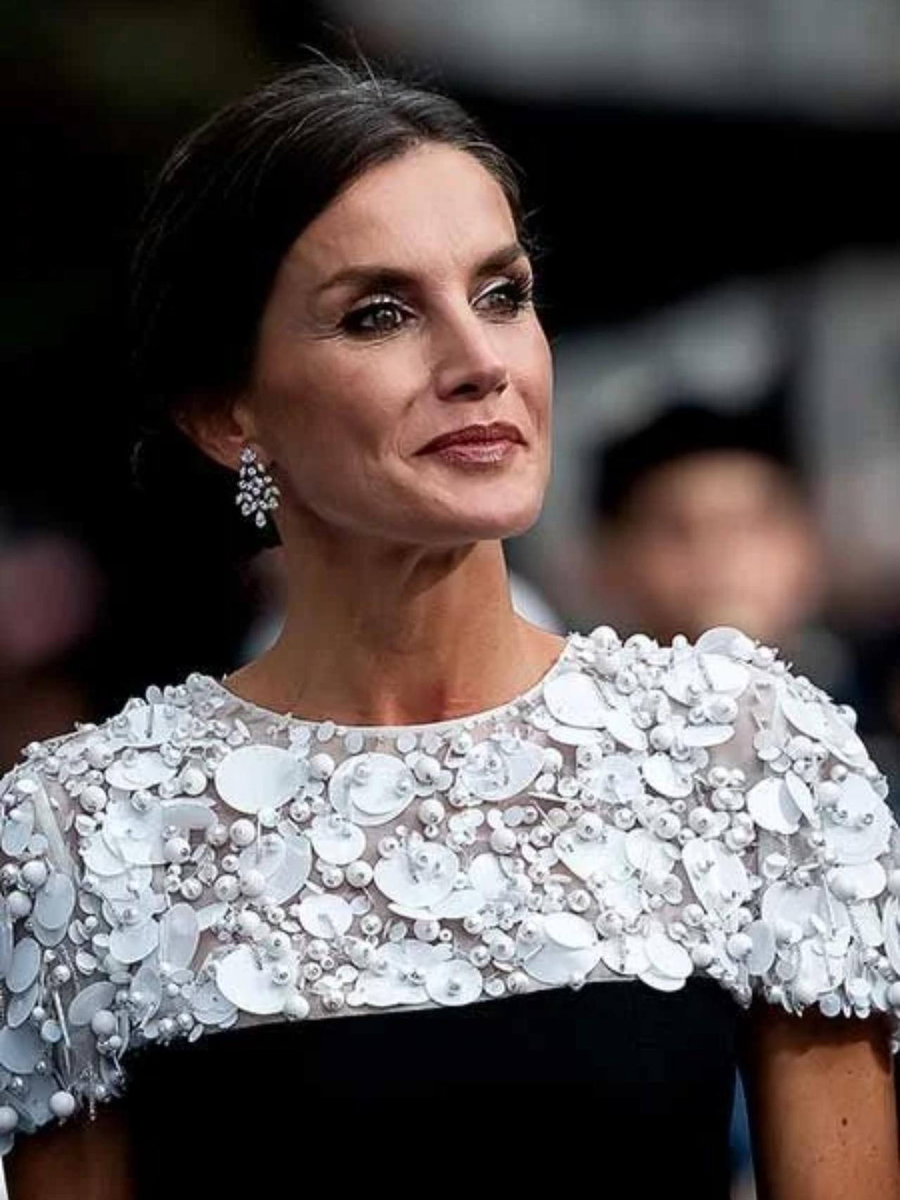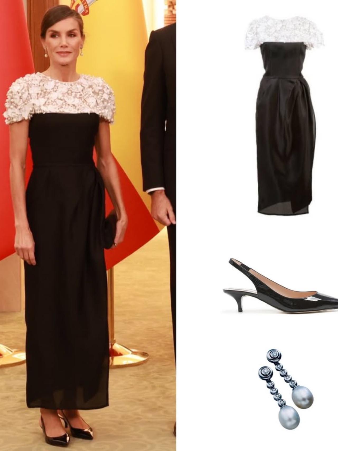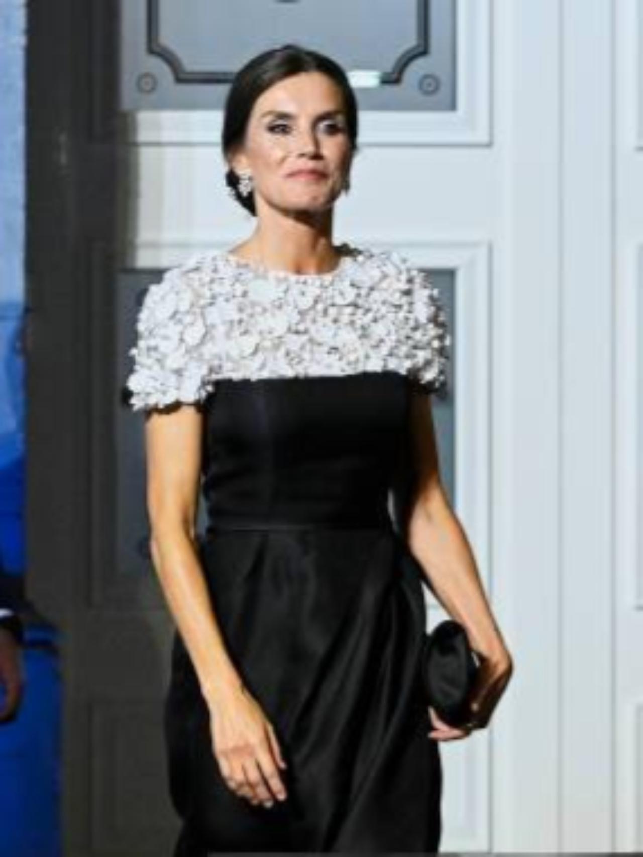 莱蒂齐亚王后颜值高,笑靥如花好惊艳 出席中方晚宴,莱蒂齐亚王后一袭黑色连衣裙惊艳亮相。肩部白色花卉刺绣精致点缀,搭配黑色高跟鞋,经典黑白配尽显高雅品味。整体造型简约自然,时尚感拉满,这位西班牙王后颜值与气质双在线,实在无可挑剔。
